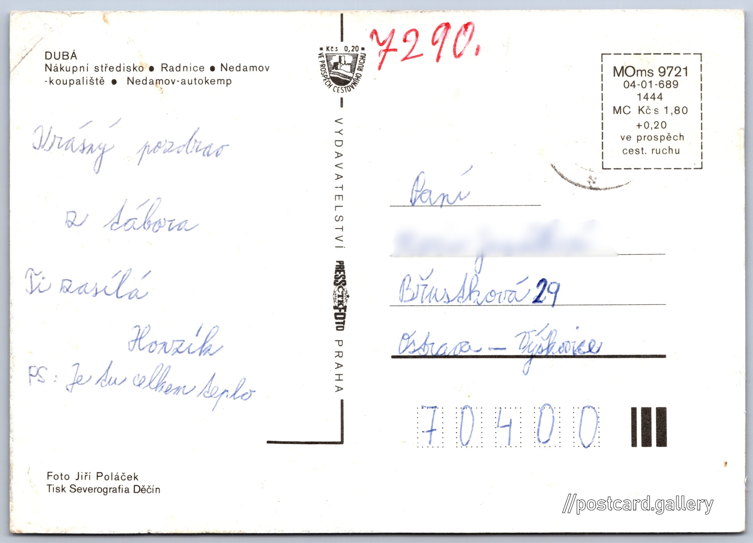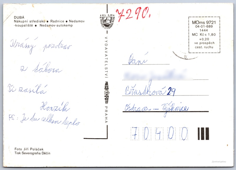 Dubá 1/2 Pokud chcete vidět pohlednice ve vyšším rozlišení nebo zobrazovat jejich zadní stranu, tak se prosím nejdříve přihlašte Přihlásit Zaregistrovat Dubá DUBÁ- Nákupní středisko- Radnice- Nedamov - koupaliště- Nedamov - autokemp Jazyk tištěného textu na pohlednici: čeština Českolipská, Dubá, Česká Lípa ukázat na mapě Vydavatel: PressFoto Bratislava (Československo) Rok vydání pohlednice: 1986 Velikost (š x v) a tvar pohlednice: 148 x 105 mm (5.83" x 4.13"), obdélník Osoby spjaté s touto pohlednicí: Jiří Poláček(Autor fotografie) Prošlá poštou DiskuseVložit příspěvek Přidat novou složku ... Spravovat složky ...