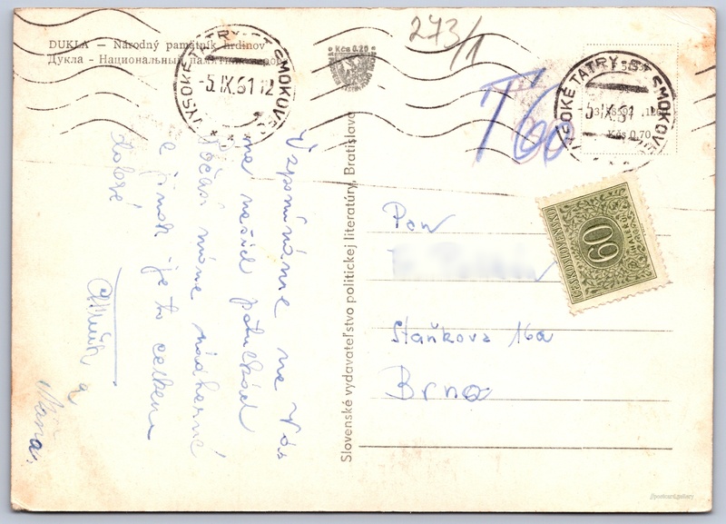 Dukla, národní památník hrdinů Pokud chcete vidět pohlednice ve vyšším rozlišení nebo zobrazovat jejich zadní stranu, tak se prosím nejdříve přihlašte Přihlásit Zaregistrovat DUKLA - Narodný pamätník hrdinovДукла - Национальный памятник героев Jazyky tištěného textu na pohlednici: slovenština, ruština Vyšný Komárnik ukázat na mapě V blízkém okolí místa zobrazeného na pohlednici lze najít 10 jiných pohlednic. Zobrazit blízké pohlednice Vydavatel: VPL (Československo) Odhadované datum vydání pohlednice: 1958 - 1961 Pomozte nám zpřesnit rok vzniku pohlednice Velikost (š x v) a tvar pohlednice: 144 x 103 mm (5.67" x 4.06"), obdélník Prošlá poštou:Datum na razítku: 5.9.1961 Ceny: Vyplacené známky: 0,60 Kčs (CSK) DiskuseVložit příspěvek Přidat novou složku ... Spravovat složky ...