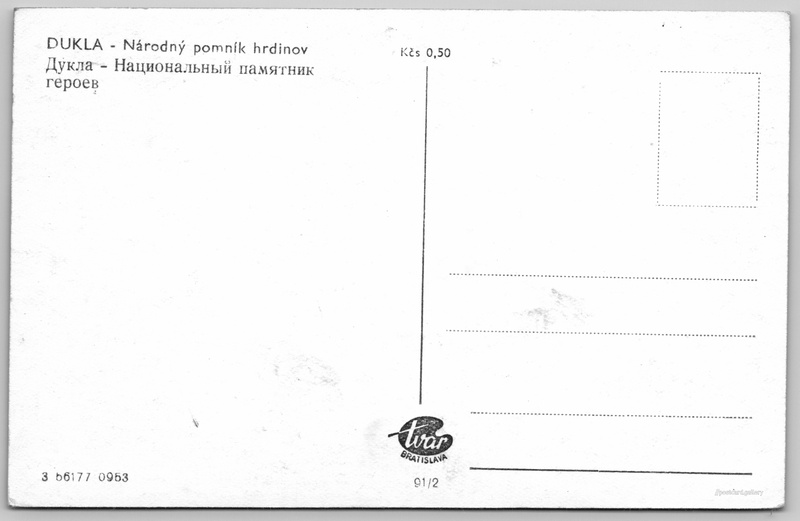 Dukla, pomník hrdinům Pokud chcete vidět pohlednice ve vyšším rozlišení nebo zobrazovat jejich zadní stranu, tak se prosím nejdříve přihlašte Přihlásit Zaregistrovat DUKLA - Národný pomník hrdinovДукла - Национальный памятНИК героев Jazyky tištěného textu na pohlednici: slovenština, ruština Vyšný Komárnik ukázat na mapě V blízkém okolí místa zobrazeného na pohlednici lze najít 10 jiných pohlednic. Zobrazit blízké pohlednice Vydavatel: Tvar Bratislava (Československo) Datum vydání není známo Pomozte nám odhadnout datum vzniku pohlednice Velikost (š x v) a tvar pohlednice: 136 x 86 mm (5.35" x 3.39"), obdélník Čistá pohlednice (neprošlá poštou) Ceny: Cena pohlednice: 0,50 Kčs (CSK) Kódy na pohlednici: 3 66177 0953 91/2 DiskuseVložit příspěvek Přidat novou složku ... Spravovat složky ...