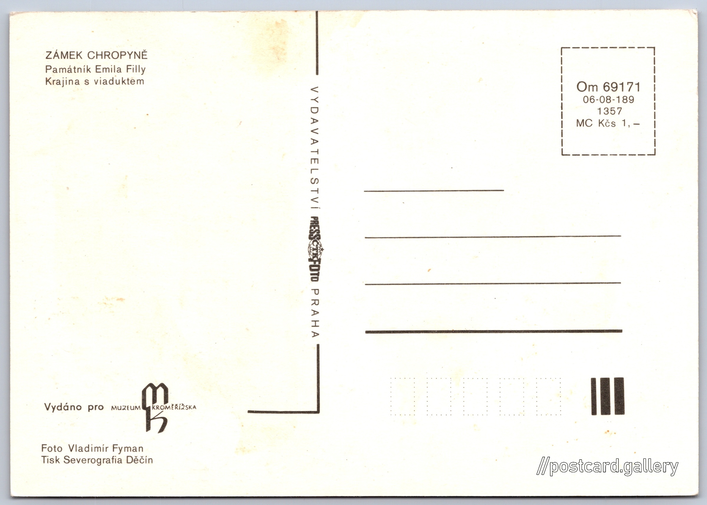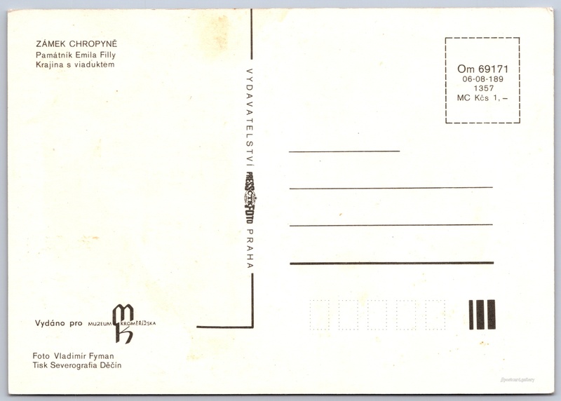Emil Filla, Krajina s viaduktem Pokud chcete vidět pohlednice ve vyšším rozlišení nebo zobrazovat jejich zadní stranu, tak se prosím nejdříve přihlašte Přihlásit Zaregistrovat ZÁMEK CHROPYNĚPamátník Emila FillyKrajina s viaduktemVydáno pro MUZEUM KROMĚŘÍŽSKA Jazyk tištěného textu na pohlednici: čeština Vydavatel: PressFoto Praha (Československo) Rok vydání pohlednice: 1981 Velikost (š x v) a tvar pohlednice: 147 x 104 mm (5.79" x 4.09"), obdélník Osoby spjaté s touto pohlednicí: Vladimír Fyman(Autor fotografie) Emil Filla(Obsah pohlednice) Čistá pohlednice (neprošlá poštou) Ceny: Cena pohlednice: 1,00 Kčs (CSK) Kódy na pohlednici: Om 69171 06-08-189 1357 DiskuseVložit příspěvek Přidat novou složku ... Spravovat složky ...