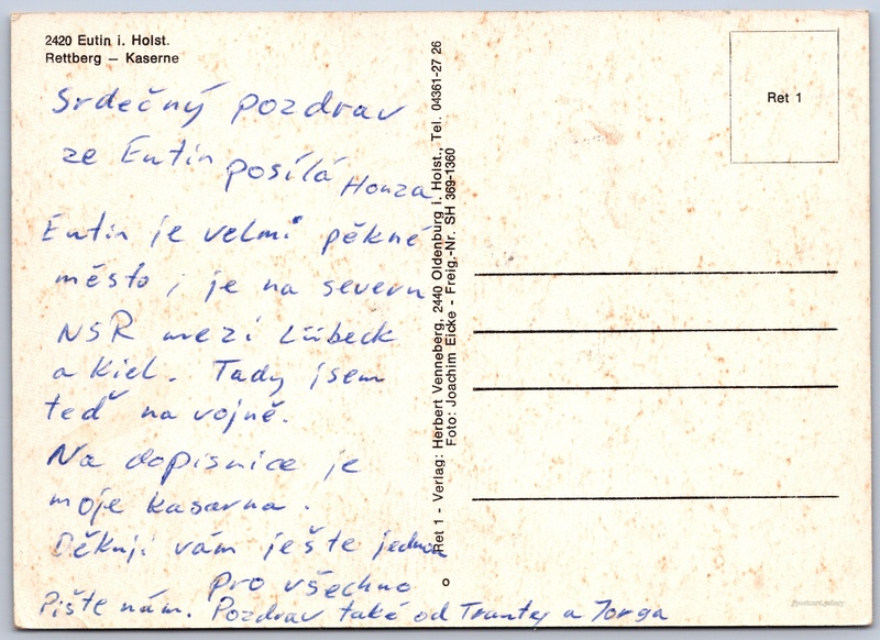 Eutin, kasárna Pokud chcete vidět pohlednice ve vyšším rozlišení nebo zobrazovat jejich zadní stranu, tak se prosím nejdříve přihlašte Přihlásit Zaregistrovat 2420 Eutin i. Holst.Rettberg - Kaserne Jazyk tištěného textu na pohlednici: čeština Eutin ukázat na mapě Vydavatel: Herbert Venneberg (Německo) Datum vydání není známo Pomozte nám odhadnout datum vzniku pohlednice Velikost (š x v) a tvar pohlednice: 147 x 105 mm (5.79" x 4.13"), obdélník Osoby spjaté s touto pohlednicí: Joachim Eicke(Autor fotografie) Prošlá poštou Kódy na pohlednici: Ret 1 DiskuseVložit příspěvek Přidat novou složku ... Spravovat složky ...