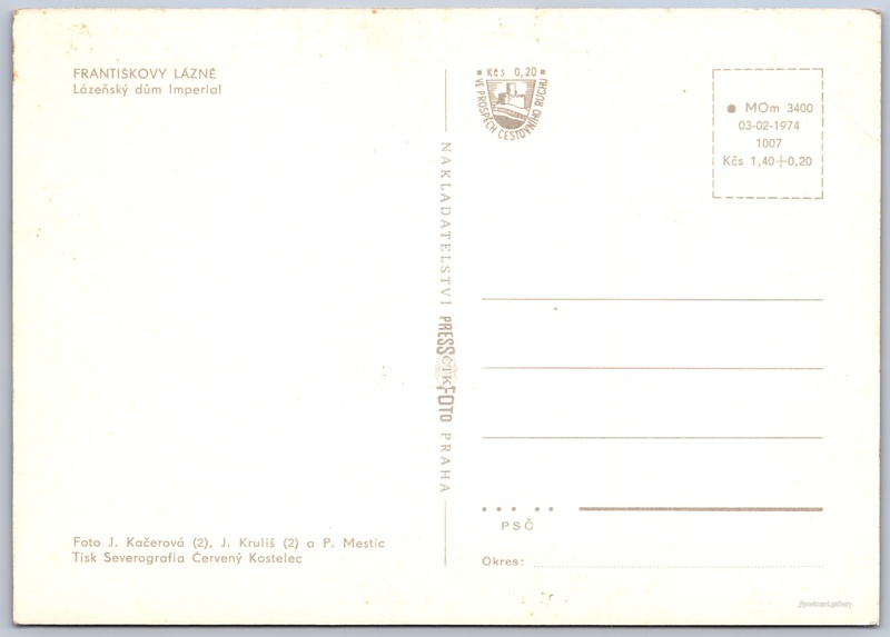 Františkovy Lázně, lázeňský dům Imperial Pokud chcete vidět pohlednice ve vyšším rozlišení nebo zobrazovat jejich zadní stranu, tak se prosím nejdříve přihlašte Přihlásit Zaregistrovat Františkovy Lázně FRANTIŠKOVY LÁZNĚLázeňský dům Imperial Jazyk tištěného textu na pohlednici: čeština Lázeňský dům Imperiál, Historická budova, Dr. Pohoreckého 151/3, Františkovy Lázně, Česko ukázat na mapě V blízkém okolí místa zobrazeného na pohlednici lze najít 51 jiných pohlednic. Zobrazit blízké pohlednice Vydavatel: PressFoto Praha (Československo) Datum vydání není známo Pomozte nám odhadnout datum vzniku pohlednice Velikost (š x v) a tvar pohlednice: 148 x 105 mm (5.83" x 4.13"), obdélník Osoby spjaté s touto pohlednicí: Jarmila Kačerová(Autor fotografie) Jiří Kruliš(Autor fotografie) Petr Mestic(Autor fotografie) Čistá pohlednice (neprošlá poštou) Ceny: Cena pohlednice: 1,40 Kčs (CSK) (+0,20 Kčs přípl. na tur. ruch) Kódy na pohlednici: •MOm 3400 03-02-1974 1007 DiskuseVložit příspěvek Přidat novou složku ... Spravovat složky ...