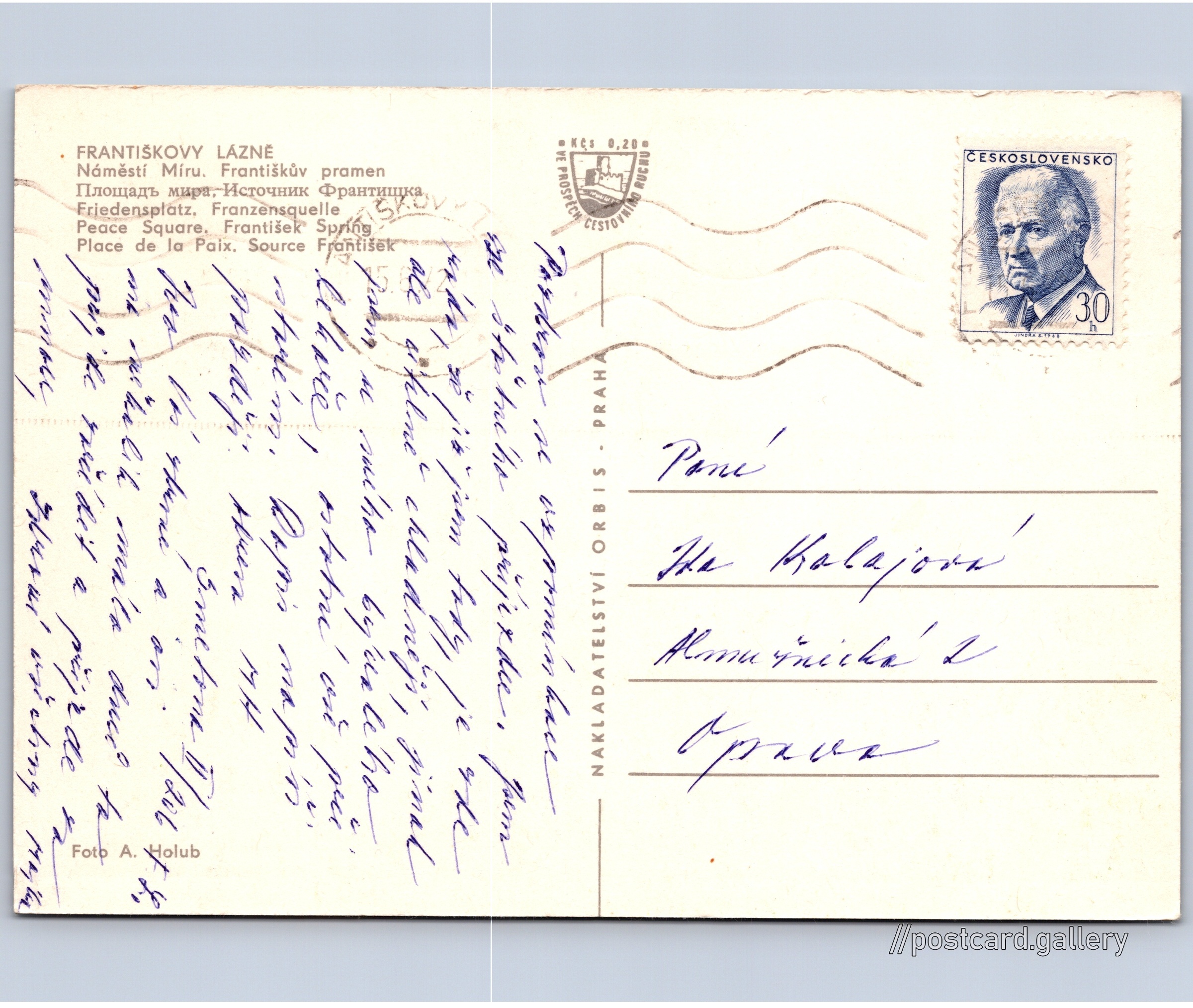 Františkovy lázně, Náměstí míru Pokud chcete vidět pohlednice ve vyšším rozlišení nebo zobrazovat jejich zadní stranu, tak se prosím nejdříve přihlašte Přihlásit Zaregistrovat FRANTIŠKOVY LÁZNĚ- Náměstí Míru. Františkův pramen- Площадъ мира. Источник Франтицка- Peace Square. František Spring- Friedensplatz. Franzensquelle- Place de la Paix. Source František Jazyk tištěného textu na pohlednici: čeština František, Minerální pramen, náměstí Míru, Františkovy Lázně, Česko ukázat na mapě V blízkém okolí místa zobrazeného na pohlednici lze najít 50 jiných pohlednic. Zobrazit blízké pohlednice Vydavatel: Nakladatelství Orbis (Československo) Odhadované datum vydání pohlednice: 1969 - 1972 Pomozte nám zpřesnit rok vzniku pohlednice Velikost (š x v) a tvar pohlednice: 148 x 104 mm (5.83" x 4.09"), obdélník Osoby spjaté s touto pohlednicí: Antonín Holub(Autor fotografie) Prošlá poštou:Datum na razítku: 15.6.1972 Ceny: Příplatek na tur. ruch: 0,20 Kčs (CSK))Vyplacené známky: 0,30 Kčs (CSK) DiskuseVložit příspěvek Přidat novou složku ... Spravovat složky ...