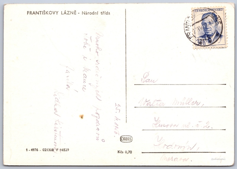 Františkovy lázně, Národní třída Pokud chcete vidět pohlednice ve vyšším rozlišení nebo zobrazovat jejich zadní stranu, tak se prosím nejdříve přihlašte Přihlásit Zaregistrovat FRANTIŠKOVY LÁZNĚ - Národní třída Jazyk tištěného textu na pohlednici: čeština Národní, Františkovy Lázně, Cheb ukázat na mapě V blízkém okolí místa zobrazeného na pohlednici lze najít 49 jiných pohlednic. Zobrazit blízké pohlednice Vydavatel: Nakladatelství Orbis (Československo) Odhadované datum vydání pohlednice: 1953 - 1956 Pomozte nám zpřesnit rok vzniku pohlednice Velikost (š x v) a tvar pohlednice: 147 x 103 mm (5.79" x 4.06"), obdélník Prošlá poštou:Datum na razítku: 27.4.1956Datum napsání pohledu: 25.4.1956 Ceny: Cena pohlednice: 0,70 Kčs (CSK)Vyplacené známky: 0,30 Kčs (CSK) Kódy na pohlednici: 1-4976 021308 F 16529 DiskuseVložit příspěvek Přidat novou složku ... Spravovat složky ...