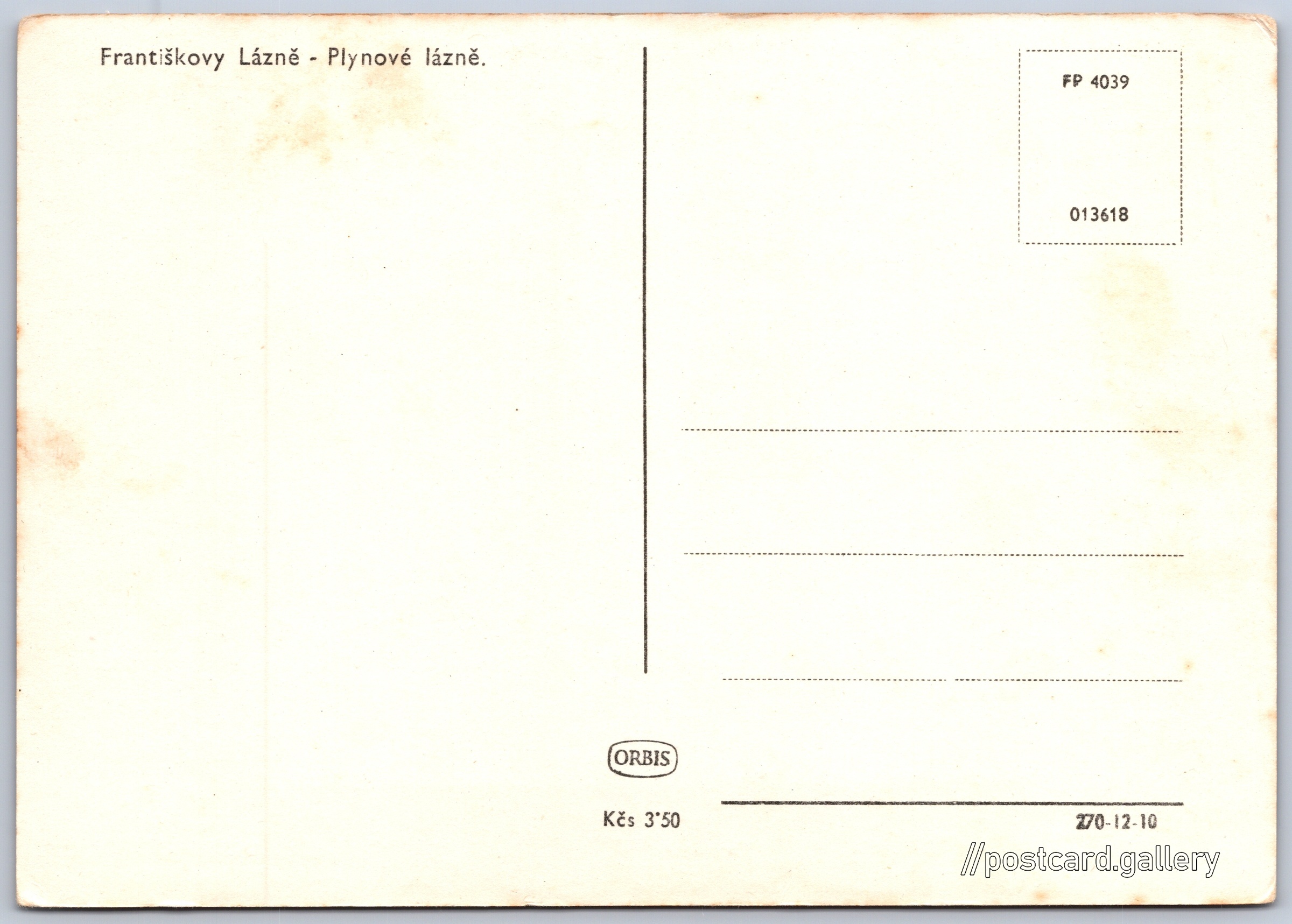 Františkovy lázně, Plynové lázně Pokud chcete vidět pohlednice ve vyšším rozlišení nebo zobrazovat jejich zadní stranu, tak se prosím nejdříve přihlašte Přihlásit Zaregistrovat Františkovy Lázně - Plynové lázně. Jazyk tištěného textu na pohlednici: čeština Boženy Němcové 116/21, Františkovy Lázně, 351 01, Cheb ukázat na mapě V blízkém okolí místa zobrazeného na pohlednici lze najít 50 jiných pohlednic. Zobrazit blízké pohlednice Vydavatel: Nakladatelství Orbis (Československo) Odhadované datum vydání pohlednice: 1950 - 1953 Pomozte nám zpřesnit rok vzniku pohlednice Velikost (š x v) a tvar pohlednice: 147 x 104 mm (5.79" x 4.09"), obdélník Čistá pohlednice (neprošlá poštou) Ceny: Cena pohlednice: 3,50 Kčs (CSK) Kódy na pohlednici: FP 4039 013618 270-12-10 DiskuseVložit příspěvek Přidat novou složku ... Spravovat složky ...