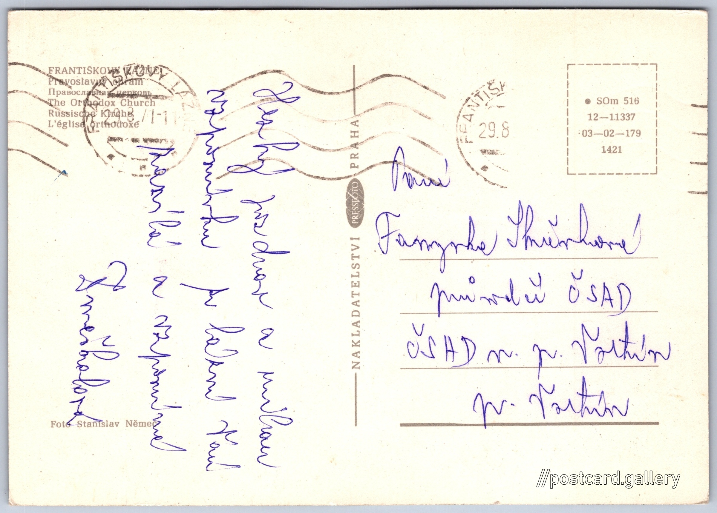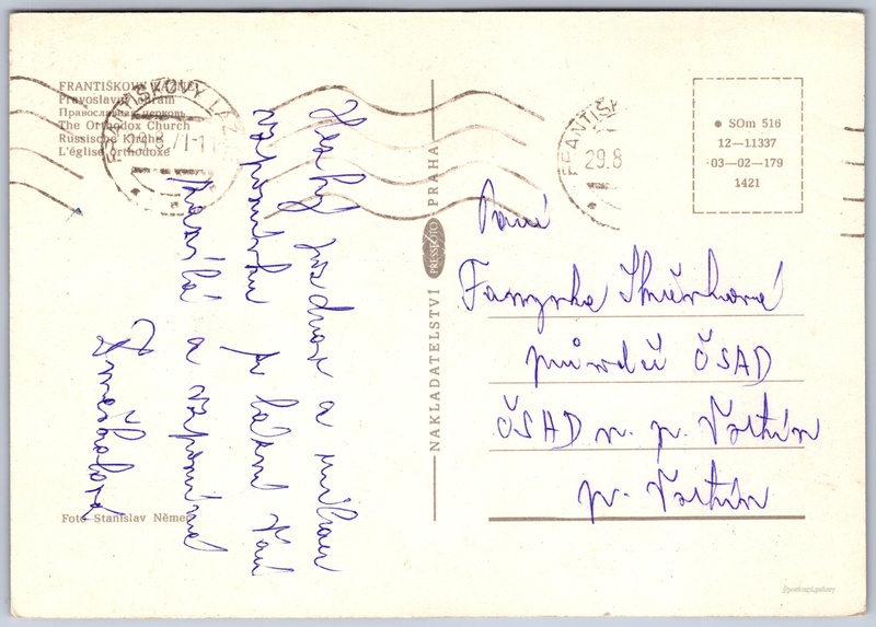 Františkovy Lázně, pravoslavný chrám Pokud chcete vidět pohlednice ve vyšším rozlišení nebo zobrazovat jejich zadní stranu, tak se prosím nejdříve přihlašte Přihlásit Zaregistrovat FRANTIŠKOVY LÁZNĚ- Pravoslavaslavný chrám- Православная cерковь- The Orthodox Church- Russische Kirche- L'église orthodoxe Jazyky tištěného textu na pohlednici: čeština, ruština, angličtina, němčina, francouzština, francouzština Kollárova 166/6, Františkovy Lázně, 351 01, Cheb ukázat na mapě V blízkém okolí místa zobrazeného na pohlednici lze najít 50 jiných pohlednic. Zobrazit blízké pohlednice Vydavatel: PressFoto Praha (Československo) Rok vydání pohlednice: 1971 Velikost (š x v) a tvar pohlednice: 147 x 103 mm (5.79" x 4.06"), obdélník Osoby spjaté s touto pohlednicí: Stanislav Němec(Autor fotografie) Prošlá poštou:Datum na razítku: 29.8.1971 Kódy na pohlednici: •SOm 516 12-11337 03-02-179 1421 DiskuseVložit příspěvek Přidat novou složku ... Spravovat složky ...