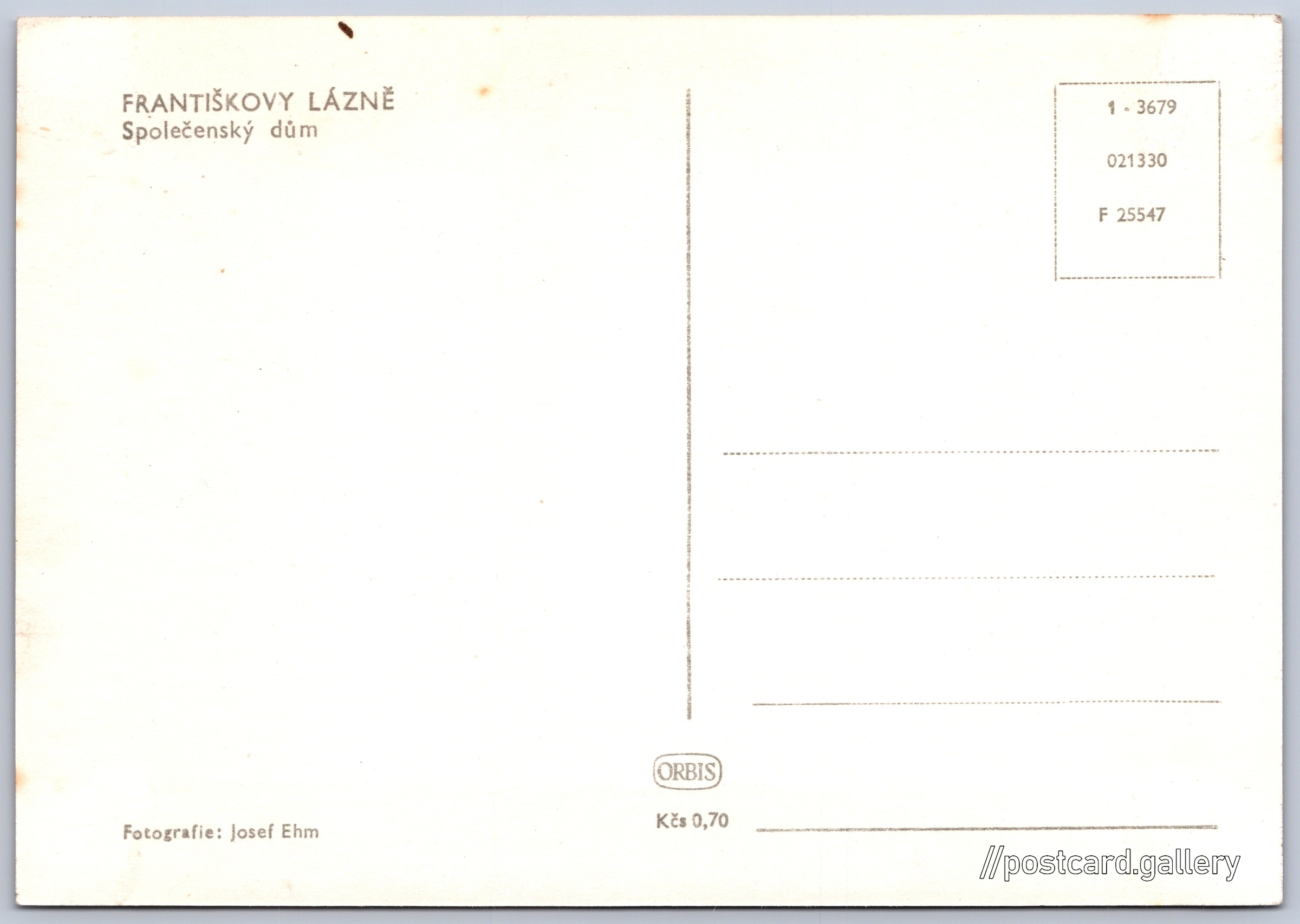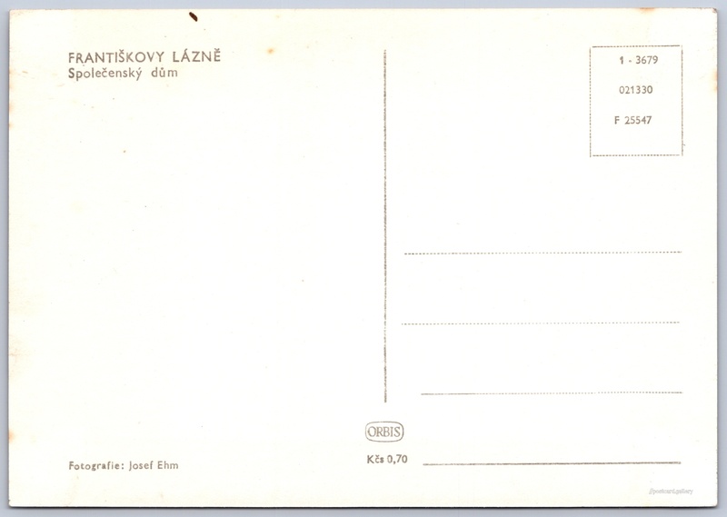 Františkovy lázně, Společenský dům Pokud chcete vidět pohlednice ve vyšším rozlišení nebo zobrazovat jejich zadní stranu, tak se prosím nejdříve přihlašte Přihlásit Zaregistrovat FRANTIŠKOVY LÁZNĚSpolečenský dům Jazyk tištěného textu na pohlednici: čeština Národní 1/12, Františkovy Lázně, 351 01, Cheb ukázat na mapě V blízkém okolí místa zobrazeného na pohlednici lze najít 50 jiných pohlednic. Zobrazit blízké pohlednice Vydavatel: Nakladatelství Orbis (Československo) Datum vydání není známo Pomozte nám odhadnout datum vzniku pohlednice Velikost (š x v) a tvar pohlednice: 146 x 102 mm (5.75" x 4.02"), obdélník Osoby spjaté s touto pohlednicí: Josef Ehm(Autor fotografie) Čistá pohlednice (neprošlá poštou) Ceny: Cena pohlednice: 0,70 Kčs (CSK) Kódy na pohlednici: 1-3679 021330 F 25547 DiskuseVložit příspěvek Přidat novou složku ... Spravovat složky ...