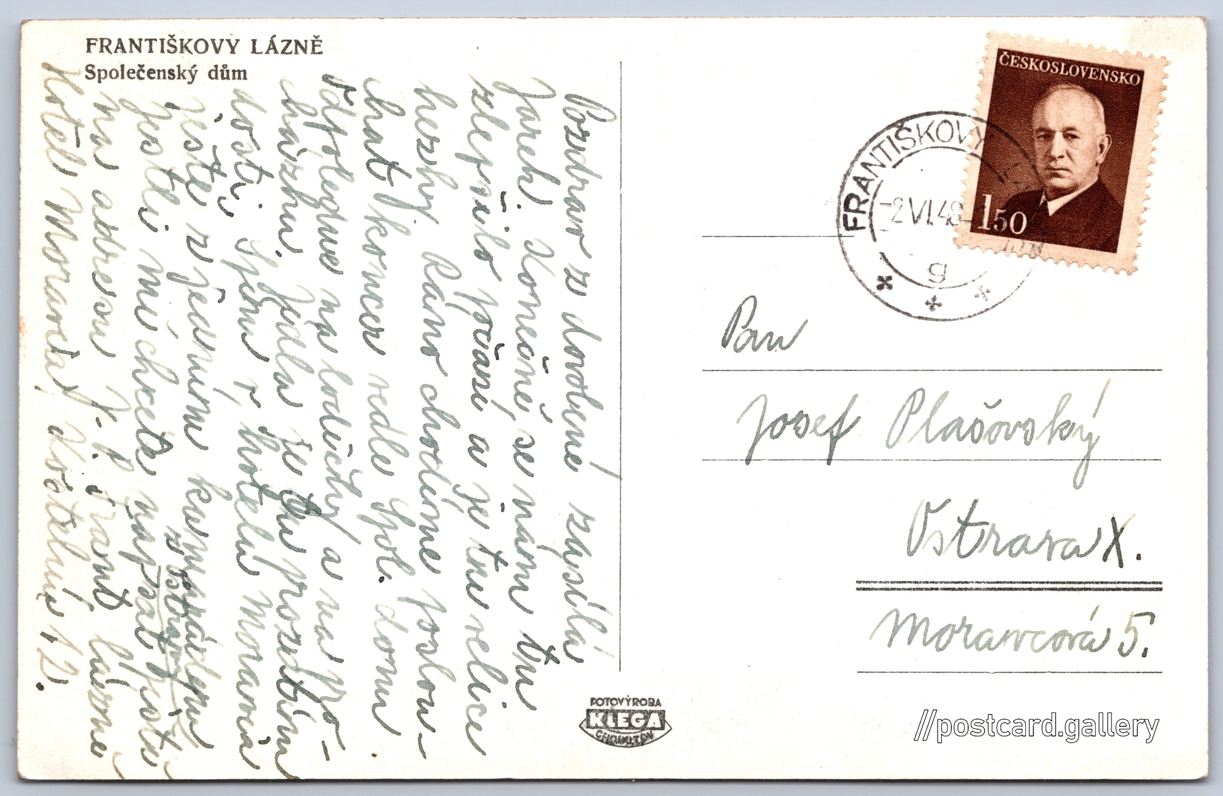 Františkovy Lázně, společenský dům Pokud chcete vidět pohlednice ve vyšším rozlišení nebo zobrazovat jejich zadní stranu, tak se prosím nejdříve přihlašte Přihlásit Zaregistrovat FRANTIŠKOVY LÁZNĚSpolečenský dům Jazyk tištěného textu na pohlednici: čeština Františkovy Lázně, Cheb ukázat na mapě V blízkém okolí místa zobrazeného na pohlednici lze najít 50 jiných pohlednic. Zobrazit blízké pohlednice Vydavatel: Fotovýroba Klega (Československo) Odhadované datum vydání pohlednice: 1945 - 1948 Pomozte nám zpřesnit rok vzniku pohlednice Velikost (š x v) a tvar pohlednice: 138 x 89 mm (5.43" x 3.50"), obdélník Prošlá poštou:Datum na razítku: 2.6.1948 Ceny: Vyplacené známky: 1,50 Kčs (CSK) DiskuseVložit příspěvek Přidat novou složku ... Spravovat složky ...