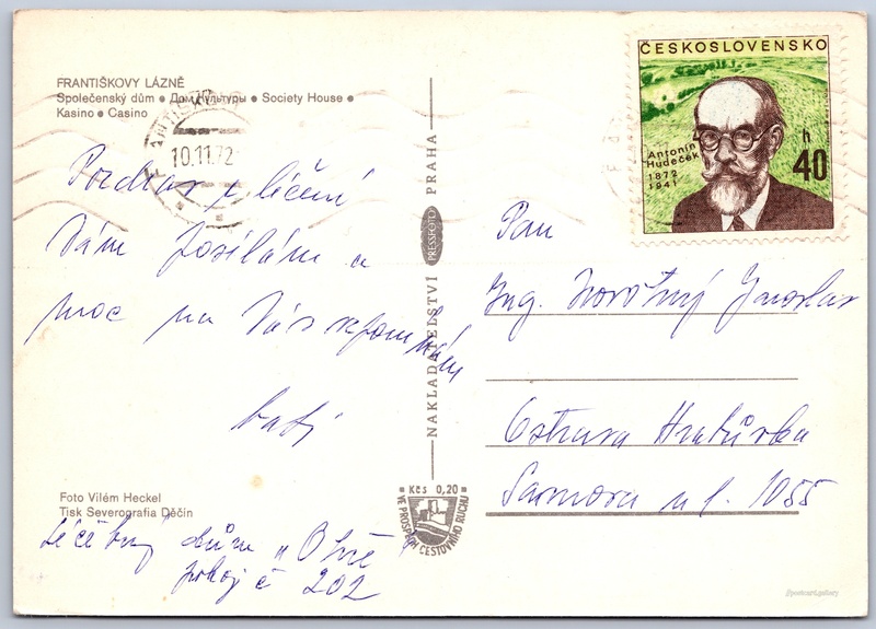 Františkovy Lázně, Společenský dům Pokud chcete vidět pohlednice ve vyšším rozlišení nebo zobrazovat jejich zadní stranu, tak se prosím nejdříve přihlašte Přihlásit Zaregistrovat FRANTIŠKOVY LÁZNĚ- Společensky düm- Дом культуры- Society House- Kasino- Casino Jazyky tištěného textu na pohlednici: čeština, ruština, angličtina, němčina, francouzština, francouzština Františkovy Lázně, Cheb ukázat na mapě V blízkém okolí místa zobrazeného na pohlednici lze najít 50 jiných pohlednic. Zobrazit blízké pohlednice Vydavatel: PressFoto Praha (Československo) Odhadované datum vydání pohlednice: 1969 - 1972 Pomozte nám zpřesnit rok vzniku pohlednice Velikost (š x v) a tvar pohlednice: 148 x 105 mm (5.83" x 4.13"), obdélník Osoby spjaté s touto pohlednicí: Vilém Heckel(Autor fotografie) Prošlá poštou:Datum na razítku: 10.11.1972 Ceny: Příplatek na tur. ruch: 0,20 Kčs (CSK))Vyplacené známky: 0,40 Kčs (CSK) DiskuseVložit příspěvek Přidat novou složku ... Spravovat složky ...