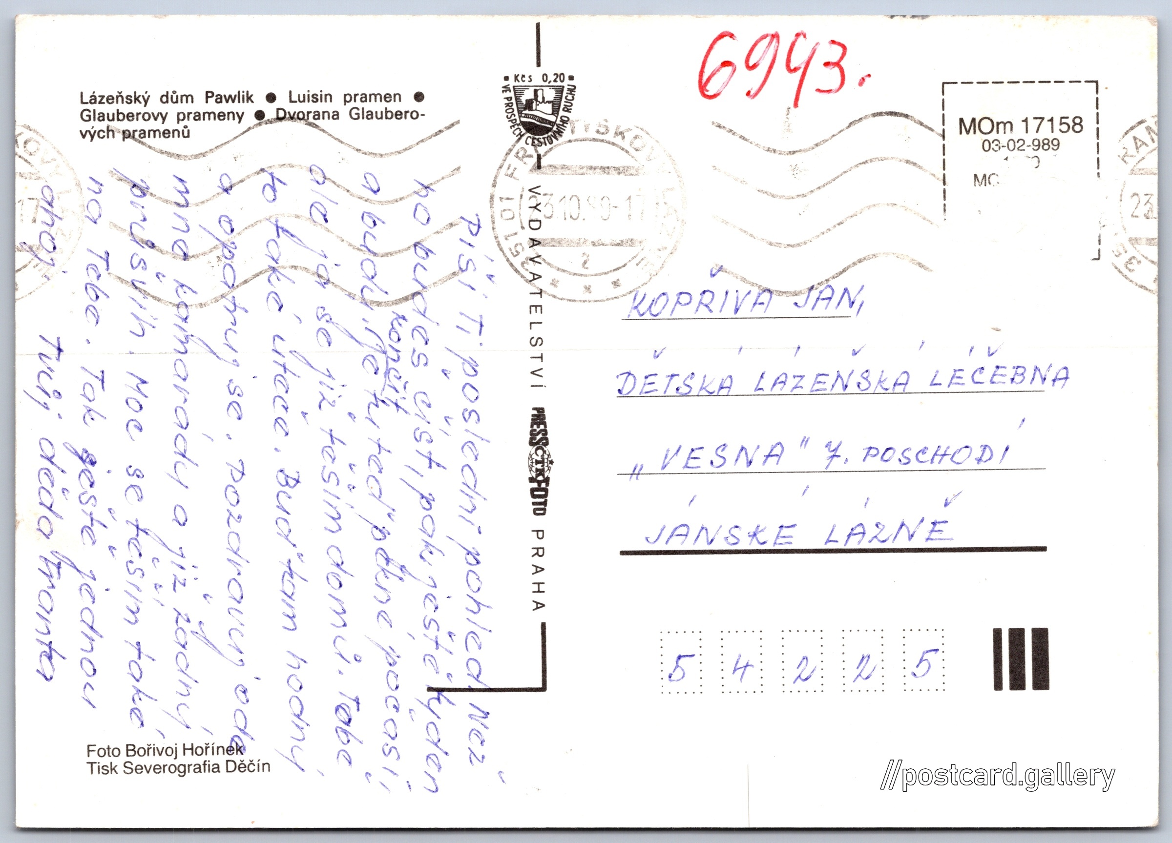Františkovy Lázně Pokud chcete vidět pohlednice ve vyšším rozlišení nebo zobrazovat jejich zadní stranu, tak se prosím nejdříve přihlašte Přihlásit Zaregistrovat Františkovy Lázně - Lázeňský dům Pawlik- Luisin pramen- Glauberovy prameny- Dvorana Glauberových pramenů Jazyk tištěného textu na pohlednici: čeština Františkovy Lázně, Cheb ukázat na mapě Vydavatel: PressFoto Praha (Československo) Rok vydání pohlednice: 1989 Velikost (š x v) a tvar pohlednice: 148 x 105 mm (5.83" x 4.13"), obdélník Osoby spjaté s touto pohlednicí: Bořivoj Hořínek(Autor fotografie) Prošlá poštou:Datum na razítku: 23.10.1989 Ceny: Příplatek na tur. ruch: 0,20 Kčs (CSK)) Kódy na pohlednici: MOm 17158 03-02-989 DiskuseVložit příspěvek Přidat novou složku ... Spravovat složky ...