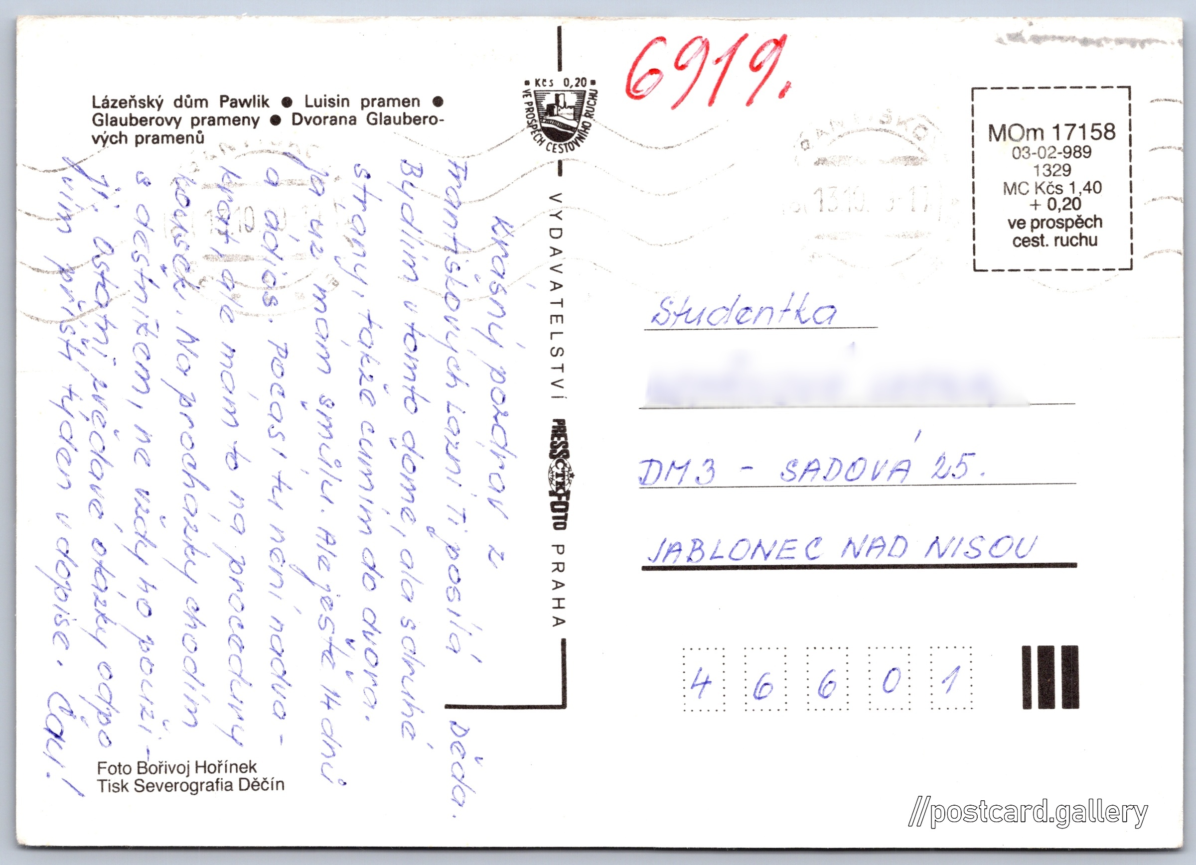 Františkovy Lázně 8/16 Pokud chcete vidět pohlednice ve vyšším rozlišení nebo zobrazovat jejich zadní stranu, tak se prosím nejdříve přihlašte Přihlásit Zaregistrovat Františkovy Lázně - Lázeňský dům Pawlik- Luisin pramen- Glauberovy prameny- Dvorana Glauberových pramenů Jazyk tištěného textu na pohlednici: čeština Františkovy Lázně, Cheb ukázat na mapě Vydavatel: PressFoto Praha (Československo) Rok vydání pohlednice: 1989 Velikost (š x v) a tvar pohlednice: 148 x 106 mm (5.83" x 4.17"), obdélník Osoby spjaté s touto pohlednicí: Bořivoj Hořínek(Autor fotografie) Prošlá poštou Ceny: Cena pohlednice: 1,40 Kčs (CSK) (+0,20 Kčs přípl. na tur. ruch) Kódy na pohlednici: MOm 17158 03-02-989 1329 DiskuseVložit příspěvek Přidat novou složku ... Spravovat složky ...