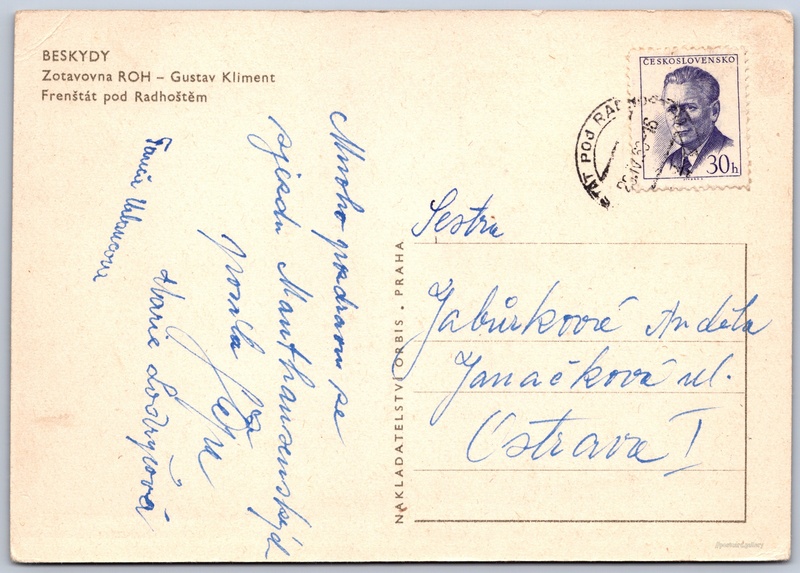 Frenštát pod Radhoštěm, zotavovna Gustav Kliment Pokud chcete vidět pohlednice ve vyšším rozlišení nebo zobrazovat jejich zadní stranu, tak se prosím nejdříve přihlašte Přihlásit Zaregistrovat BESKYDYZotavovna ROH - Gustav KlimentFrenštát pod Radhoštěm Jazyk tištěného textu na pohlednici: čeština Trojanovice 388, Trojanovice, 744 01, Nový Jičín ukázat na mapě Přesné místo není známo. Pokud jej znáte, tak jej prosím napište do komentářů nebo označte na mapě Vydavatel: Nakladatelství Orbis (Československo) Odhadované datum vydání pohlednice: 1957 - 1960 Pomozte nám zpřesnit rok vzniku pohlednice Velikost (š x v) a tvar pohlednice: 149 x 105 mm (5.87" x 4.13"), obdélník Osoby spjaté s touto pohlednicí: Gustav Kliment(Obsah pohlednice) Prošlá poštou:Datum na razítku: 23.4.1960 Ceny: Vyplacené známky: 0,30 Kčs (CSK) DiskuseVložit příspěvek Přidat novou složku ... Spravovat složky ...