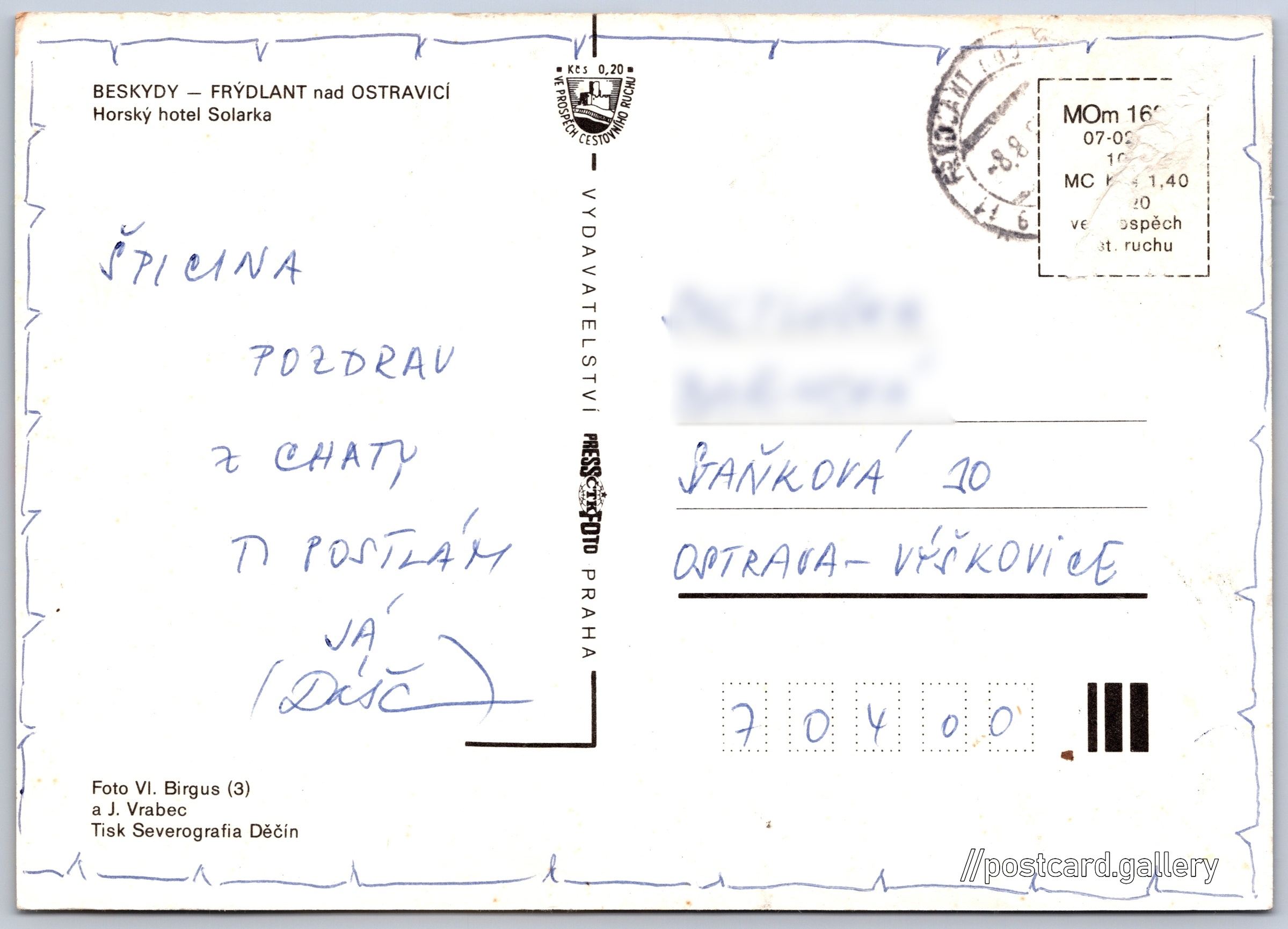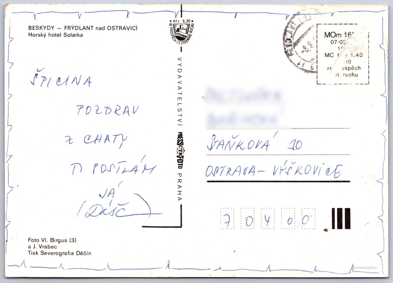 Frýdlant nad Ostravicí, hotel Solarka Pokud chcete vidět pohlednice ve vyšším rozlišení nebo zobrazovat jejich zadní stranu, tak se prosím nejdříve přihlašte Přihlásit Zaregistrovat Frýdlant nad Ostravicíhotel Solárka BESKYDY - FRÝDLANT nad OSTRAVICÍHorský hotel Solarka Jazyk tištěného textu na pohlednici: čeština Bývalá chata Solárka, Zaniklý objekt či ves, Frýdlant nad Ostravicí - Frýdlant, Česko ukázat na mapě Vydavatel: PressFoto Praha (Československo) Datum vydání není známo Pomozte nám odhadnout datum vzniku pohlednice Velikost (š x v) a tvar pohlednice: 148 x 105 mm (5.83" x 4.13"), obdélník Osoby spjaté s touto pohlednicí: Jan Vrabec(Autor fotografie) Vladimír Birgus(Autor fotografie) Prošlá poštou Ceny: Cena pohlednice: 1,40 Kčs (CSK) (+0,20 Kčs přípl. na tur. ruch) DiskuseVložit příspěvek Přidat novou složku ... Spravovat složky ...