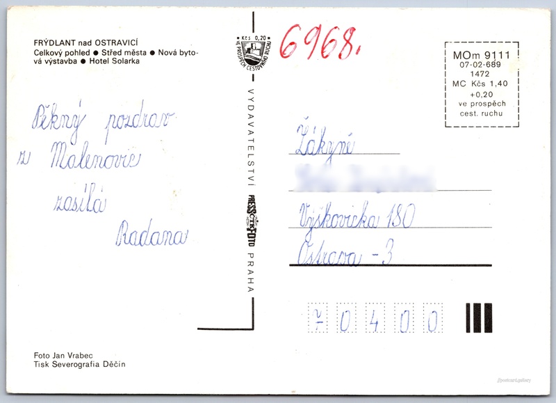 Frýdlant nad Ostravicí Pokud chcete vidět pohlednice ve vyšším rozlišení nebo zobrazovat jejich zadní stranu, tak se prosím nejdříve přihlašte Přihlásit Zaregistrovat Frýdlant nad Ostravicí FRÝDLANT nad OSTRAVICÍ- Celkový pohled- Střed města- Nová bytová výstavba- Hotel Solarka Jazyk tištěného textu na pohlednici: čeština Frýdlant nad Ostravicí, Město, Česko ukázat na mapě Vydavatel: PressFoto Praha (Československo) Rok vydání pohlednice: 1986 Velikost (š x v) a tvar pohlednice: 148 x 105 mm (5.83" x 4.13"), obdélník Osoby spjaté s touto pohlednicí: Jan Vrabec(Autor fotografie) Prošlá poštou Ceny: Cena pohlednice: 1,40 Kčs (CSK) (+0,20 Kčs přípl. na tur. ruch) Kódy na pohlednici: MOm 9111 07-02-689 1472 DiskuseVložit příspěvek Přidat novou složku ... Spravovat složky ...