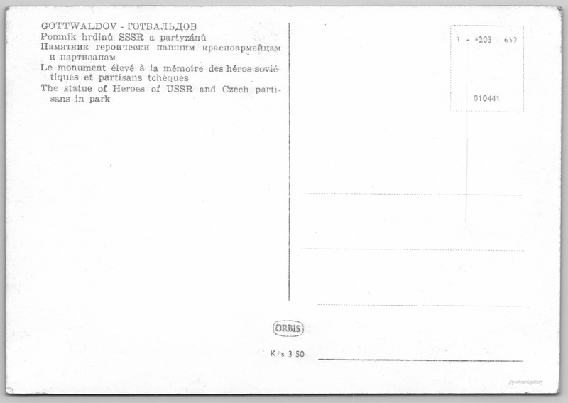 Gottwaldov, pomník hrdinů a partyzánů 3/98 Pokud chcete vidět pohlednice ve vyšším rozlišení nebo zobrazovat jejich zadní stranu, tak se prosím nejdříve přihlašte Přihlásit Zaregistrovat GOTTWALDOV - ГОТВАЛЬДОВ- Pomník hrdinů SSSR a partyzánů- Памятник героически павшим красноармейцам и партизанам- Le monument élevé à la mémoire des héros soviétiques et partisans tchèques- The statue of Heroes of USSR and Czech partisans in park Jazyk tištěného textu na pohlednici: čeština Zlín, Statutární město, Česko ukázat na mapě Přesné místo není známo. Pokud jej znáte, tak jej prosím napište do komentářů nebo označte na mapě Vydavatel: Nakladatelství Orbis (Československo) Rok vydání pohlednice: červen, 1952 Velikost (š x v) a tvar pohlednice: 146 x 101 mm (5.75" x 3.98"), obdélník Čistá pohlednice (neprošlá poštou) Ceny: Cena pohlednice: 3,50 Kčs (CSK) Kódy na pohlednici: 1-203-652 010441 DiskuseVložit příspěvek Přidat novou složku ... Spravovat složky ...