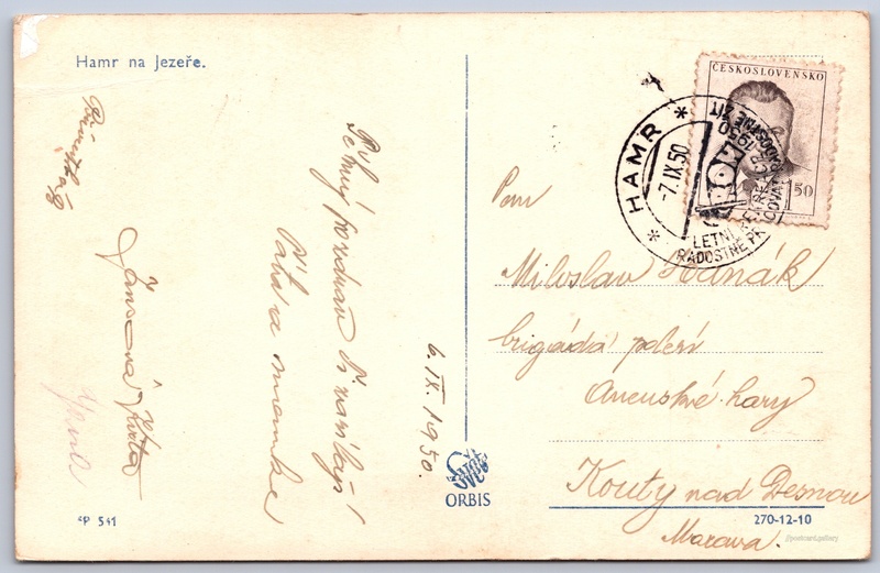 Hamr na jezeře Pokud chcete vidět pohlednice ve vyšším rozlišení nebo zobrazovat jejich zadní stranu, tak se prosím nejdříve přihlašte Přihlásit Zaregistrovat Hamr na Jezeře. Jazyk tištěného textu na pohlednici: čeština Liberecká, Hamr na Jezeře, Česká Lípa ukázat na mapě Přesné místo není známo. Pokud jej znáte, tak jej prosím napište do komentářů nebo označte na mapě Vydavatel: Nakladatelství Orbis (Československo) Odhadované datum vydání pohlednice: 1947 - 1950 Pomozte nám zpřesnit rok vzniku pohlednice Velikost (š x v) a tvar pohlednice: 139 x 89 mm (5.47" x 3.50"), obdélník Prošlá poštou:Datum na razítku: 7.9.1950Datum napsání pohledu: 6.9.1950 Ceny: Vyplacené známky: 1,50 Kčs (CSK) Kódy na pohlednici: 270-12-10 DiskuseVložit příspěvek Přidat novou složku ... Spravovat složky ...