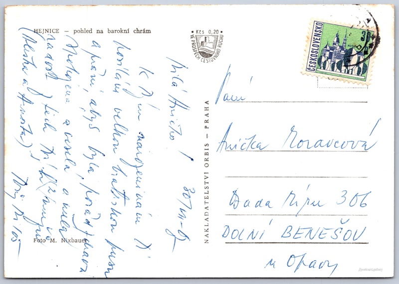 Hejnice, barokní chrám Pokud chcete vidět pohlednice ve vyšším rozlišení nebo zobrazovat jejich zadní stranu, tak se prosím nejdříve přihlašte Přihlásit Zaregistrovat HEJNICE - pohled na barokní chrám Jazyk tištěného textu na pohlednici: čeština Poutní kostel Navštívení Panny Marie, Kostel, Hejnice, Liberecký kraj, Česko ukázat na mapě V blízkém okolí místa zobrazeného na pohlednici lze najít 7 jiných pohlednic. Zobrazit blízké pohlednice Vydavatel: Nakladatelství Orbis (Československo) Odhadované datum vydání pohlednice: 1960 - 1965 Pomozte nám zpřesnit rok vzniku pohlednice Velikost (š x v) a tvar pohlednice: 148 x 103 mm (5.83" x 4.06"), obdélník Osoby spjaté s touto pohlednicí: Miloš Nixbauer(Autor fotografie) Prošlá poštou:Datum na razítku: 30.7.1967Datum napsání pohledu: 30.7.1967 Ceny: Příplatek na tur. ruch: 0,20 Kčs (CSK))Vyplacené známky: 0,30 Kčs (CSK) DiskuseVložit příspěvek Přidat novou složku ... Spravovat složky ...
