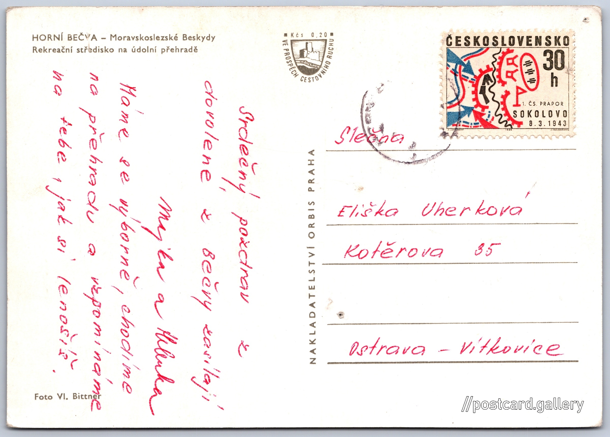 Horní Bečva, přehrada Pokud chcete vidět pohlednice ve vyšším rozlišení nebo zobrazovat jejich zadní stranu, tak se prosím nejdříve přihlašte Přihlásit Zaregistrovat HORNÍ BEČVA - Moravskoslezské BeskydyRekreační středisko na údolní přehradě Jazyk tištěného textu na pohlednici: čeština Horní Bečva, Vsetín ukázat na mapě V blízkém okolí místa zobrazeného na pohlednici lze najít 6 jiných pohlednic. Zobrazit blízké pohlednice Vydavatel: Nakladatelství Orbis (Československo) Datum vydání není známo Pomozte nám odhadnout datum vzniku pohlednice Velikost (š x v) a tvar pohlednice: 147 x 104 mm (5.79" x 4.09"), obdélník Osoby spjaté s touto pohlednicí: Vl. Bittner(Autor fotografie) Prošlá poštou Ceny: Příplatek na tur. ruch: 0,20 Kčs (CSK))Vyplacené známky: 0,30 Kčs (CSK) DiskuseVložit příspěvek Přidat novou složku ... Spravovat složky ...