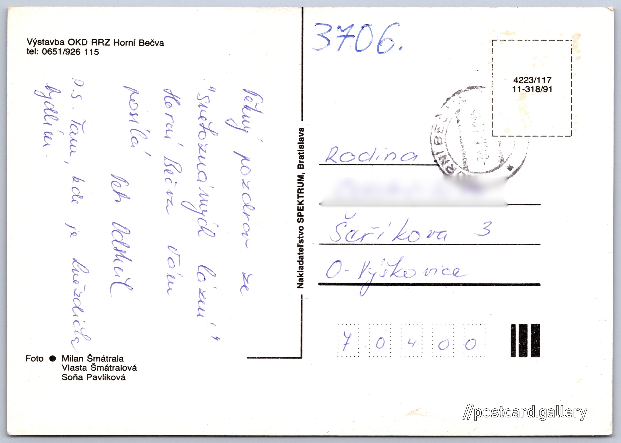 Horní Bečva 3/3 Pokud chcete vidět pohlednice ve vyšším rozlišení nebo zobrazovat jejich zadní stranu, tak se prosím nejdříve přihlašte Přihlásit Zaregistrovat Horní Bečva Výstavba OKD RRZ Horní Bečvatel: 0651/926 115 Jazyk tištěného textu na pohlednici: čeština Horní Bečva, Vsetín ukázat na mapě Vydavatel: Nakladateľstvo Spektrum (Slovensko) Rok vydání pohlednice: 1991 Velikost (š x v) a tvar pohlednice: 146 x 100 mm (5.75" x 3.94"), obdélník Osoby spjaté s touto pohlednicí: Milan Šmátrala(Autor fotografie) Soňa Pavlíková(Autor fotografie) Vlasta Šmátralová(Autor fotografie) Prošlá poštou Kódy na pohlednici: 4223/117 11-318/91 DiskuseVložit příspěvek Přidat novou složku ... Spravovat složky ...
