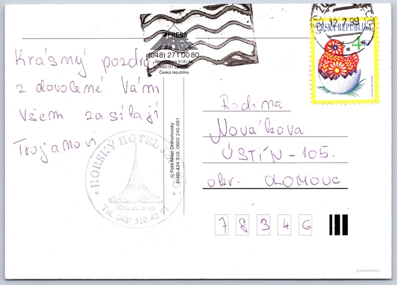 Horský hotel Ještěd Pokud chcete vidět pohlednice ve vyšším rozlišení nebo zobrazovat jejich zadní stranu, tak se prosím nejdříve přihlašte Přihlásit Zaregistrovat Rozhledna z r. 1889Horský hotel Ještěd 1012 mHotel s TV vysílačem z r. 1973Hotel z r. 1907 Jazyk tištěného textu na pohlednici: čeština Rozhledna Ještěd, Rozhledna, Liberec XIX-Horní Hanychov 153, Liberec XIX-Horní Hanychov, Česko ukázat na mapě V blízkém okolí místa zobrazeného na pohlednici lze najít 15 jiných pohlednic. Zobrazit blízké pohlednice Vydavatel: Press Image (Česko) Odhadované datum vydání pohlednice: 1996 - 1999 Pomozte nám zpřesnit rok vzniku pohlednice Velikost (š x v) a tvar pohlednice: 149 x 106 mm (5.87" x 4.17"), obdélník Osoby spjaté s touto pohlednicí: Milan Drahoňovský(Autor fotografie) Prošlá poštou:Datum na razítku: 12.7.1999 Ceny: Vyplacené známky: 4,00 Kč (CZK) DiskuseVložit příspěvek Přidat novou složku ... Spravovat složky ...