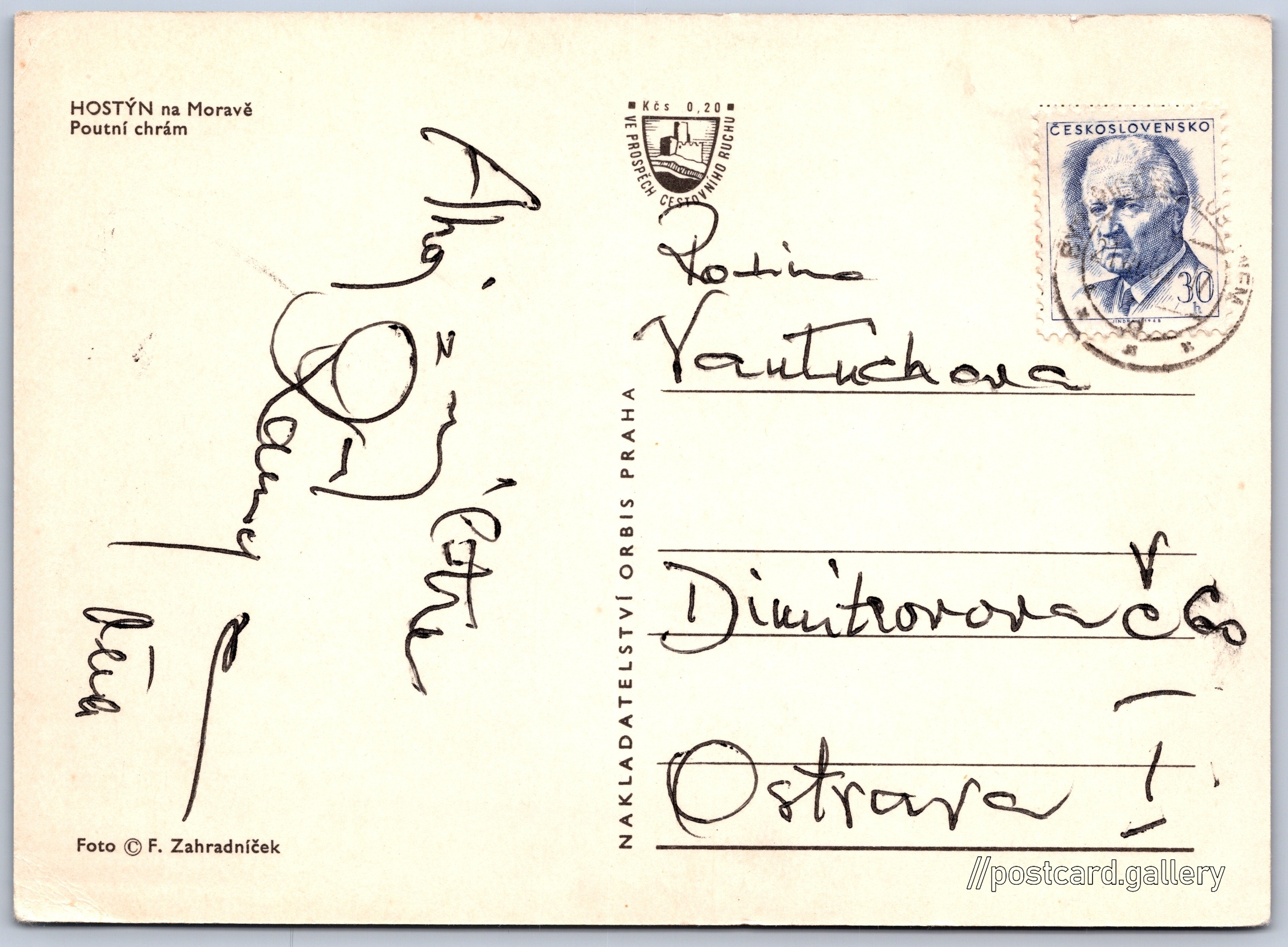 Hostýn na Moravě, poutní chrám 5/15 Pokud chcete vidět pohlednice ve vyšším rozlišení nebo zobrazovat jejich zadní stranu, tak se prosím nejdříve přihlašte Přihlásit Zaregistrovat HOSTÝN na MoravěPoutní chrám Jazyk tištěného textu na pohlednici: čeština Chvalčov, Kroměříž ukázat na mapě V blízkém okolí místa zobrazeného na pohlednici lze najít 16 jiných pohlednic. Zobrazit blízké pohlednice Vydavatel: Nakladatelství Orbis (Československo) Odhadované datum vydání pohlednice: 1967 - 1969 Pomozte nám zpřesnit rok vzniku pohlednice Velikost (š x v) a tvar pohlednice: 145 x 105 mm (5.71" x 4.13"), obdélník Osoby spjaté s touto pohlednicí: František Zahradníček(Autor fotografie) Prošlá poštou Ceny: Příplatek na tur. ruch: 0,20 Kčs (CSK))Vyplacené známky: 0,30 Kčs (CSK) DiskuseVložit příspěvek Přidat novou složku ... Spravovat složky ...