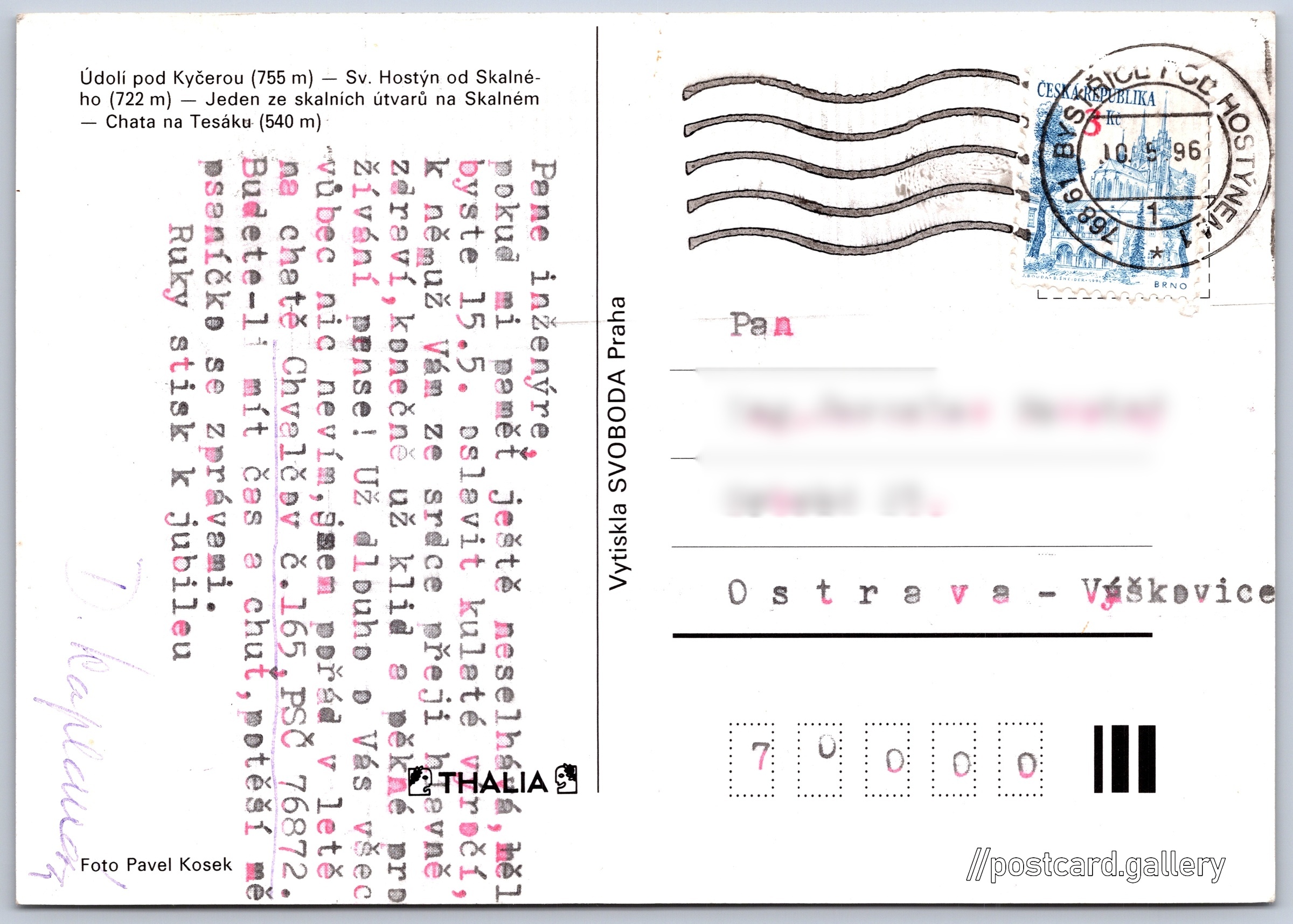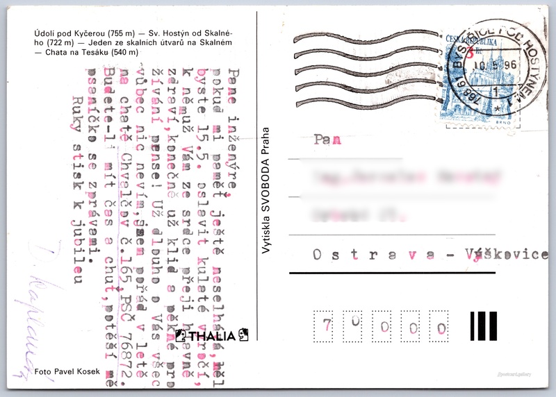 Hostýnské vrchy Pokud chcete vidět pohlednice ve vyšším rozlišení nebo zobrazovat jejich zadní stranu, tak se prosím nejdříve přihlašte Přihlásit Zaregistrovat Hostýnské vrchy - Údolí pod Kyčerou (755 m)- Sv. Hostýn od Skalného (722 m)- Jeden ze skalních útvarů na Skalném- Chata na Tesáku (540 m) Jazyk tištěného textu na pohlednici: čeština Chvalčov, Kroměříž ukázat na mapě Vydavatel: Thalia (Česko) Odhadované datum vydání pohlednice: 1993 - 1996 Pomozte nám zpřesnit rok vzniku pohlednice Velikost (š x v) a tvar pohlednice: 148 x 105 mm (5.83" x 4.13"), obdélník Osoby spjaté s touto pohlednicí: Pavel Kosek(Autor fotografie) Prošlá poštou:Datum na razítku: 10.5.1996 Ceny: Vyplacené známky: 3,00 Kč (CZK) DiskuseVložit příspěvek Přidat novou složku ... Spravovat složky ...