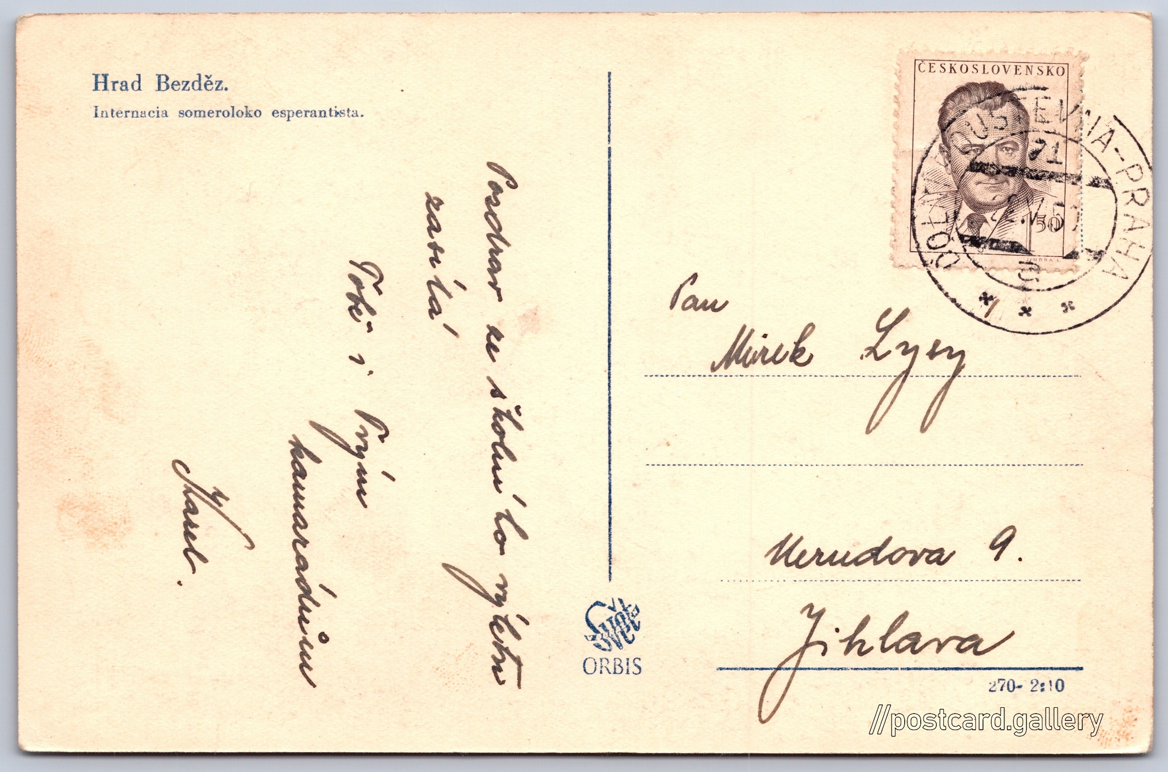 Hrad Bezděz Pokud chcete vidět pohlednice ve vyšším rozlišení nebo zobrazovat jejich zadní stranu, tak se prosím nejdříve přihlašte Přihlásit Zaregistrovat Hrad Bezděz.Internacia someroloko esperantista. Jazyk tištěného textu na pohlednici: čeština Bezděz 144, 472 01 Bezděz, Czechia ukázat na mapě V blízkém okolí místa zobrazeného na pohlednici lze najít 6 jiných pohlednic. Zobrazit blízké pohlednice Vydavatel: Nakladatelství Orbis (Československo) Odhadované datum vydání pohlednice: 1947 - 1950 Pomozte nám zpřesnit rok vzniku pohlednice Velikost (š x v) a tvar pohlednice: 139 x 91 mm (5.47" x 3.58"), obdélník Prošlá poštou:Datum na razítku: 22.5.1950 Ceny: Vyplacené známky: 1,50 Kčs (CSK) DiskuseVložit příspěvek Přidat novou složku ... Spravovat složky ...