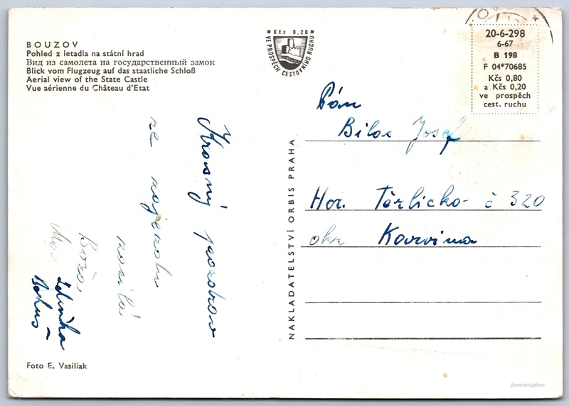 Hrad Bouzov, letecký pohled Pokud chcete vidět pohlednice ve vyšším rozlišení nebo zobrazovat jejich zadní stranu, tak se prosím nejdříve přihlašte Přihlásit Zaregistrovat BOUZOV- Pohled z letadla na státní hrad- Вид из самолета на государственный замок- Blick vom Flugzeug auf das staatliche Schloß- Aerial view of the State Castle- Vue aérienne du Château d'Etat Jazyk tištěného textu na pohlednici: čeština Hrad Bouzov, Hrad, Bouzov, Česko ukázat na mapě V blízkém okolí místa zobrazeného na pohlednici lze najít 20 jiných pohlednic. Zobrazit blízké pohlednice Vydavatel: Nakladatelství Orbis (Československo) Datum vydání není známo Pomozte nám odhadnout datum vzniku pohlednice Velikost (š x v) a tvar pohlednice: 147 x 103 mm (5.79" x 4.06"), obdélník Osoby spjaté s touto pohlednicí: Eugen Vasiliak(Autor fotografie) Prošlá poštou Ceny: Cena pohlednice: 0,80 Kčs (CSK) (+0,20 Kčs přípl. na tur. ruch) Kódy na pohlednici: 20-6-298 6-67 B 198 F 04*70685 DiskuseVložit příspěvek Přidat novou složku ... Spravovat složky ...