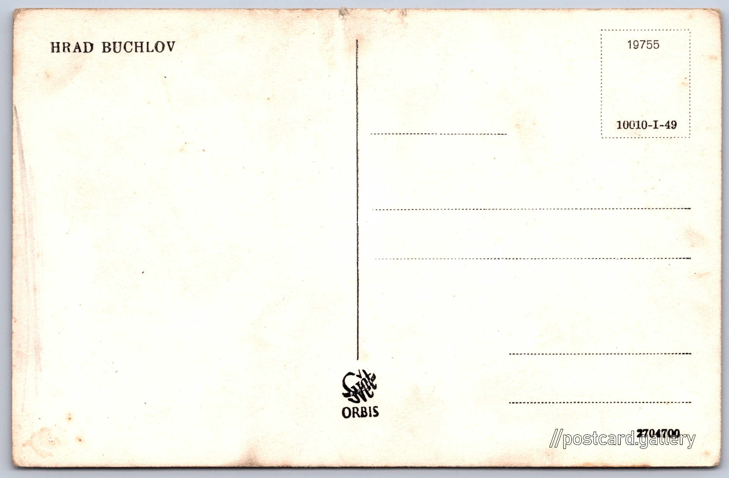 Hrad Buchlov Pokud chcete vidět pohlednice ve vyšším rozlišení nebo zobrazovat jejich zadní stranu, tak se prosím nejdříve přihlašte Přihlásit Zaregistrovat HRAD BUCHLOV Jazyk tištěného textu na pohlednici: čeština Polesí 418, 687 08 Buchlovice, Czechia ukázat na mapě V blízkém okolí místa zobrazeného na pohlednici lze najít 7 jiných pohlednic. Zobrazit blízké pohlednice Vydavatel: Nakladatelství Orbis (Československo) Datum vydání není známo Pomozte nám odhadnout datum vzniku pohlednice Velikost (š x v) a tvar pohlednice: 139 x 90 mm (5.47" x 3.54"), obdélník Čistá pohlednice (neprošlá poštou) Kódy na pohlednici: 19755 10010-I-49 2704700 DiskuseVložit příspěvek Přidat novou složku ... Spravovat složky ...