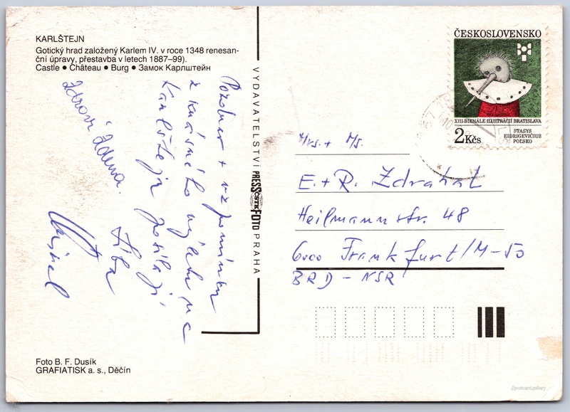 Hrad Karlštejn 10/20 Pokud chcete vidět pohlednice ve vyšším rozlišení nebo zobrazovat jejich zadní stranu, tak se prosím nejdříve přihlašte Přihlásit Zaregistrovat KARLŠTEJNGotický hrad založený Karlem IV. v roce 1348 renesanční úpravy, přestavba v letech 1887-99).- Castle- Château- Burg- 3амок Kарлштейн Jazyky tištěného textu na pohlednici: čeština, angličtina, francouzština, němčina, ruština, ruština Hrad Karlštejn, Hrad, Karlštejn 172, Karlštejn, Česko ukázat na mapě V blízkém okolí místa zobrazeného na pohlednici lze najít 20 jiných pohlednic. Zobrazit blízké pohlednice Vydavatel: PressFoto Praha (Československo) Odhadované datum vydání pohlednice: 1989 - 1992 Pomozte nám zpřesnit rok vzniku pohlednice Velikost (š x v) a tvar pohlednice: 148 x 105 mm (5.83" x 4.13"), obdélník Osoby spjaté s touto pohlednicí: Karel IV.(Obsah pohlednice) B. F. Dusík(Autor fotografie) Prošlá poštou:Datum na razítku: 10.8.1992 Ceny: Vyplacené známky: 2,00 Kč (CZK) DiskuseVložit příspěvek Přidat novou složku ... Spravovat složky ...