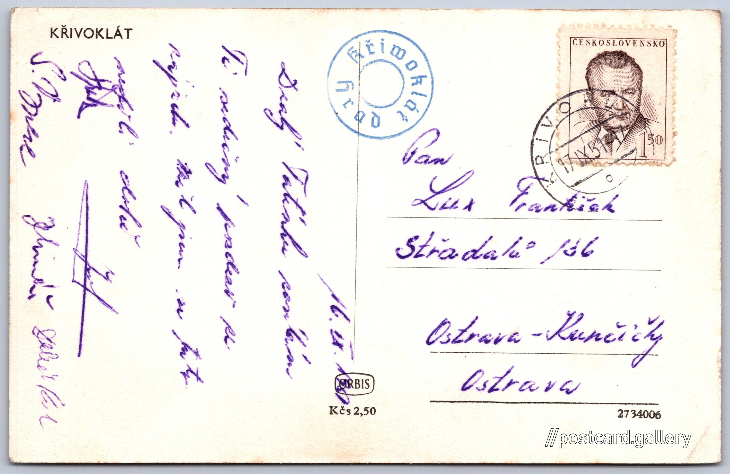 Hrad Křivoklát 8/10 Pokud chcete vidět pohlednice ve vyšším rozlišení nebo zobrazovat jejich zadní stranu, tak se prosím nejdříve přihlašte Přihlásit Zaregistrovat KŘIVOKLÁT Jazyk tištěného textu na pohlednici: čeština Křivoklát, Rakovník ukázat na mapě V blízkém okolí místa zobrazeného na pohlednici lze najít 10 jiných pohlednic. Zobrazit blízké pohlednice Vydavatel: Nakladatelství Orbis (Československo) Odhadované datum vydání pohlednice: 1948 - 1951 Pomozte nám zpřesnit rok vzniku pohlednice Velikost (š x v) a tvar pohlednice: 139 x 89 mm (5.47" x 3.50"), obdélník Prošlá poštou:Datum na razítku: 17.9.1951Datum napsání pohledu: 16.9.1951 Ceny: Cena pohlednice: 2,50 Kčs (CSK)Vyplacené známky: 1,50 Kčs (CSK) DiskuseVložit příspěvek Přidat novou složku ... Spravovat složky ...