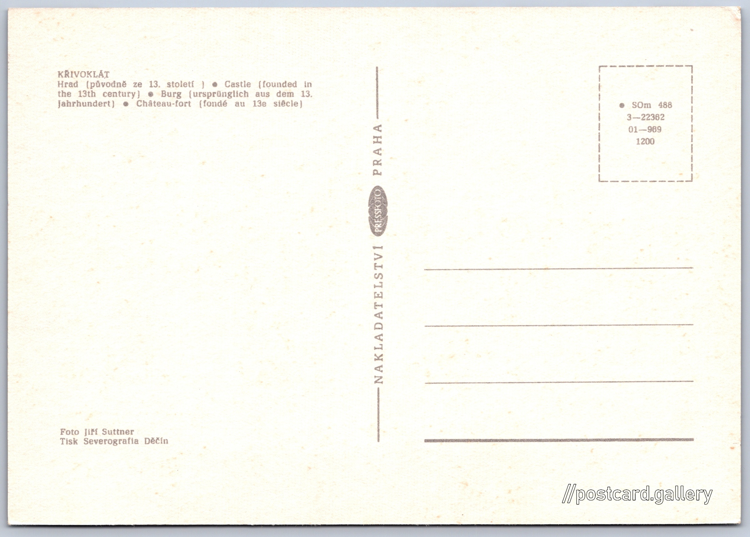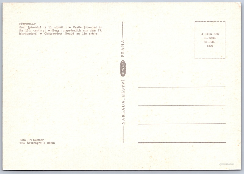 Hrad Křivoklát 8/11 Pokud chcete vidět pohlednice ve vyšším rozlišení nebo zobrazovat jejich zadní stranu, tak se prosím nejdříve přihlašte Přihlásit Zaregistrovat KŘIVOKLÁT- Hrad (původně ze 13. století)- Castle (founded in the 13th century)- Burg (ursprünglich aus dem 13. Jahrhundert)- Château-fort (fondé au 13e siècle) Jazyky tištěného textu na pohlednici: čeština, angličtina, němčina, francouzština Hrad Křivoklát, Hrad, Křivoklát 132, Křivoklát, Česko ukázat na mapě V blízkém okolí místa zobrazeného na pohlednici lze najít 10 jiných pohlednic. Zobrazit blízké pohlednice Vydavatel: PressFoto Praha (Československo) Rok vydání pohlednice: 1989 Velikost (š x v) a tvar pohlednice: 148 x 104 mm (5.83" x 4.09"), obdélník Osoby spjaté s touto pohlednicí: Jiří Suttner(Autor fotografie) Čistá pohlednice (neprošlá poštou) Kódy na pohlednici: •SOm 488 3-22362 01-989 1200 DiskuseVložit příspěvek Přidat novou složku ... Spravovat složky ...