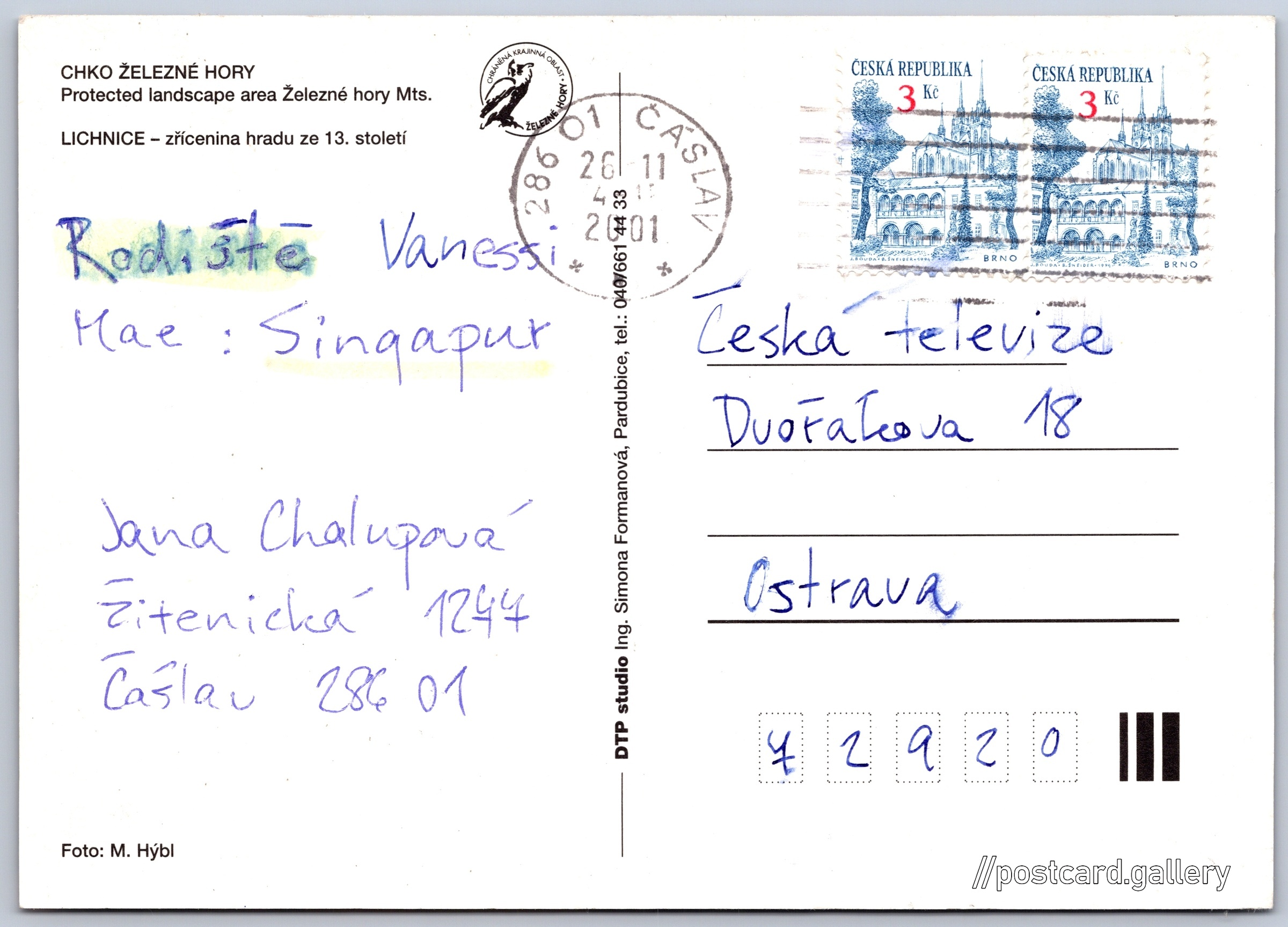 Hrad Lichnice Pokud chcete vidět pohlednice ve vyšším rozlišení nebo zobrazovat jejich zadní stranu, tak se prosím nejdříve přihlašte Přihlásit Zaregistrovat Lichnice CHKO ŽELEZNÉ HORYProtected landscape area Železné hory Mts.LICHNICE - zřícenina hradu ze 13. století Jazyky tištěného textu na pohlednici: čeština, angličtina Zřícenina hradu Lichnice, Zřícenina, Třemošnice - Podhradí, Česko ukázat na mapě Vydavatel: DTP studio Ing. Simona Formanová (Česko) Odhadované datum vydání pohlednice: 1998 - 2001 Pomozte nám zpřesnit rok vzniku pohlednice Velikost (š x v) a tvar pohlednice: 146 x 104 mm (5.75" x 4.09"), obdélník Osoby spjaté s touto pohlednicí: M. Hýbl(Autor fotografie) Prošlá poštou:Datum na razítku: 26.11.2001 Ceny: Vyplacené známky: 6,00 Kčs (CSK) DiskuseVložit příspěvek Přidat novou složku ... Spravovat složky ...
