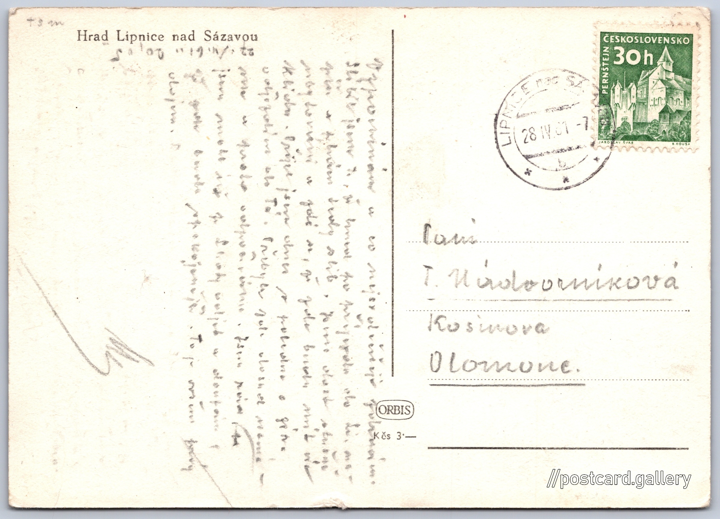 Hrad Lipnice nad Sázavou 1/4 Pokud chcete vidět pohlednice ve vyšším rozlišení nebo zobrazovat jejich zadní stranu, tak se prosím nejdříve přihlašte Přihlásit Zaregistrovat Hrad Lipnice nad Sázavou Jazyk tištěného textu na pohlednici: čeština Hrad Lipnice, Hrad, Lipnice nad Sázavou 1, Lipnice nad Sázavou, Česko ukázat na mapě V blízkém okolí místa zobrazeného na pohlednici lze najít 4 jiné pohlednice. Zobrazit blízké pohlednice Vydavatel: Nakladatelství Orbis (Československo) Odhadované datum vydání pohlednice: 1950 - 1953 Pomozte nám zpřesnit rok vzniku pohlednice Velikost (š x v) a tvar pohlednice: 146 x 104 mm (5.75" x 4.09"), obdélník Prošlá poštou:Datum na razítku: 28.4.1961 Ceny: Cena pohlednice: 3,00 Kčs (CSK)Vyplacené známky: 0,30 Kčs (CSK) DiskuseVložit příspěvek Přidat novou složku ... Spravovat složky ...