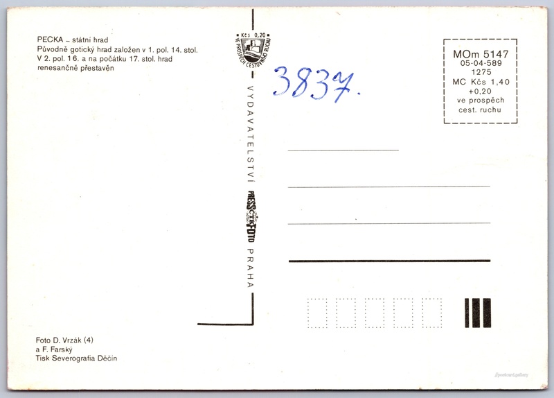 Hrad Pecka Pokud chcete vidět pohlednice ve vyšším rozlišení nebo zobrazovat jejich zadní stranu, tak se prosím nejdříve přihlašte Přihlásit Zaregistrovat Hrad Pecka PECKA - státní hradPůvodně gotický hrad založen v 1. pol. 14. stol. V 2. pol. 16, a na počátku 17. stol. hrad renesančně přestavěn Jazyk tištěného textu na pohlednici: čeština Hrad Pecka, Hrad, Pecka 1, Pecka, Česko ukázat na mapě Vydavatel: PressFoto Praha (Československo) Rok vydání pohlednice: 1985 Velikost (š x v) a tvar pohlednice: 148 x 105 mm (5.83" x 4.13"), obdélník Osoby spjaté s touto pohlednicí: Daniel Vrzák(Autor fotografie) Fr. Farský(Autor fotografie) Čistá pohlednice (neprošlá poštou) Ceny: Cena pohlednice: 1,40 Kčs (CSK) (+0,20 Kčs přípl. na tur. ruch) Kódy na pohlednici: MOm 5147 05-04-589 1275 DiskuseVložit příspěvek Přidat novou složku ... Spravovat složky ...