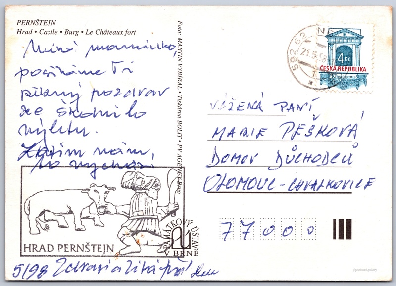 Hrad Pernštejn, letecký pohled Pokud chcete vidět pohlednice ve vyšším rozlišení nebo zobrazovat jejich zadní stranu, tak se prosím nejdříve přihlašte Přihlásit Zaregistrovat PERNŠTEJN- Hrad- Castle- Burg- Le Châteaux fort Jazyky tištěného textu na pohlednici: čeština, angličtina, němčina, francouzština Hrad Pernštejn, Hrad, Pernštejn 13, Nedvědice - Pernštejn, Česko ukázat na mapě V blízkém okolí místa zobrazeného na pohlednici lze najít 2 jiné pohlednice. Zobrazit blízké pohlednice Vydavatel: PV Agency Brno (Česko) Odhadované datum vydání pohlednice: 1995 - 1998 Pomozte nám zpřesnit rok vzniku pohlednice Velikost (š x v) a tvar pohlednice: 148 x 105 mm (5.83" x 4.13"), obdélník Osoby spjaté s touto pohlednicí: Martin Vybíral(Autor fotografie) Prošlá poštou:Datum na razítku: 21.5.1998 Ceny: Vyplacené známky: 4,00 Kč (CZK) DiskuseVložit příspěvek Přidat novou složku ... Spravovat složky ...