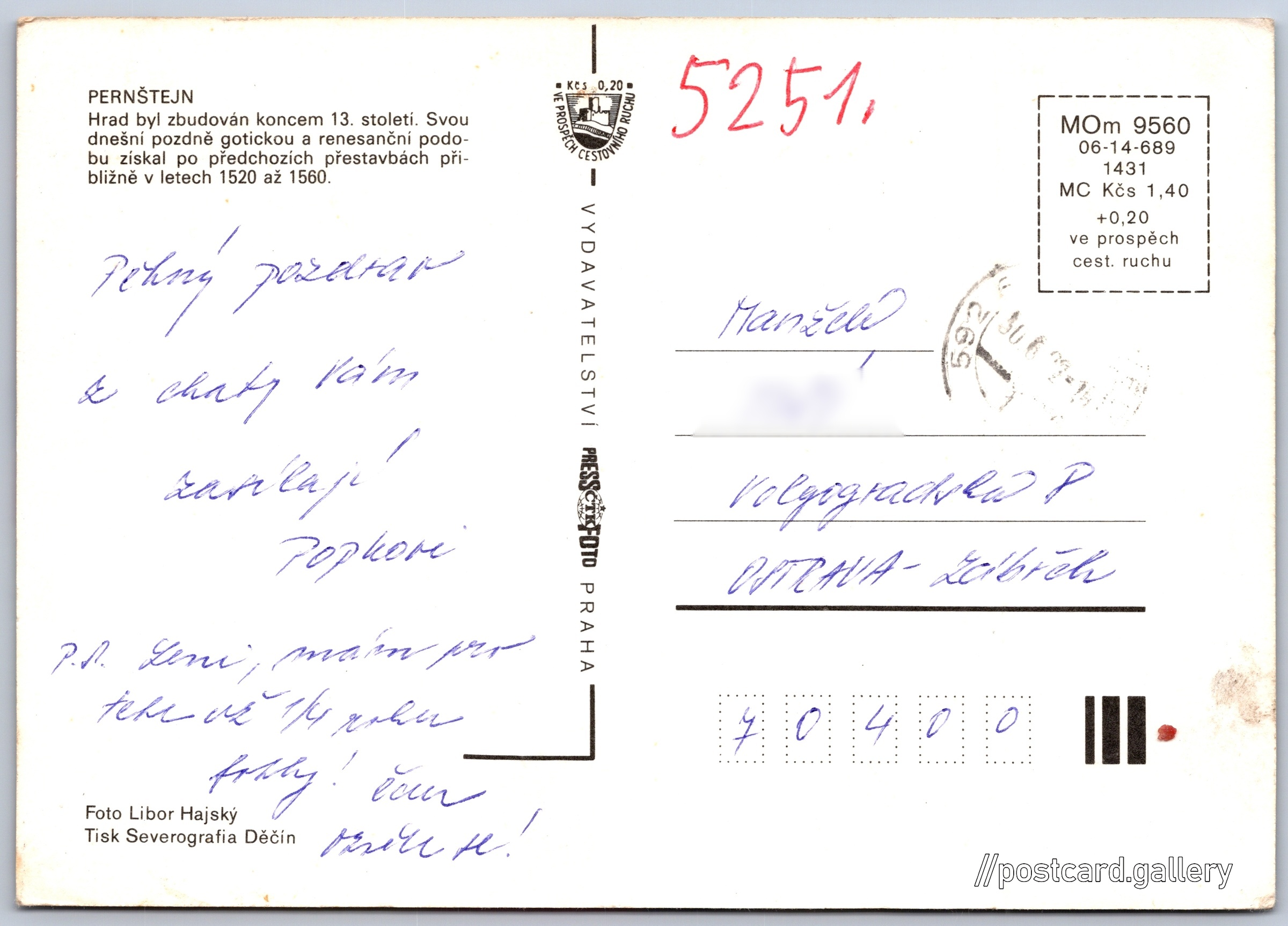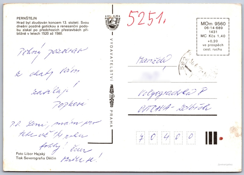 Hrad Pernštejn Pokud chcete vidět pohlednice ve vyšším rozlišení nebo zobrazovat jejich zadní stranu, tak se prosím nejdříve přihlašte Přihlásit Zaregistrovat Hrad Pernštejn PERNŠTEJNHrad byl zbudován koncem 13. století. Svou dnešní pozdně gotickou a renesanční podobu získal po předchozích přestavbách přibližně v letech 1520 až 1560. Jazyk tištěného textu na pohlednici: čeština Hrad Pernštejn, Hrad, Pernštejn 13, Nedvědice - Pernštejn, Česko ukázat na mapě Vydavatel: PressFoto Praha (Československo) Rok vydání pohlednice: 1986 Velikost (š x v) a tvar pohlednice: 148 x 105 mm (5.83" x 4.13"), obdélník Osoby spjaté s touto pohlednicí: Libor Hajský(Autor fotografie) Prošlá poštou Ceny: Cena pohlednice: 1,40 Kčs (CSK) (+0,20 Kčs přípl. na tur. ruch) Kódy na pohlednici: MOm 9560 06-14-689 1431 DiskuseVložit příspěvek Přidat novou složku ... Spravovat složky ...