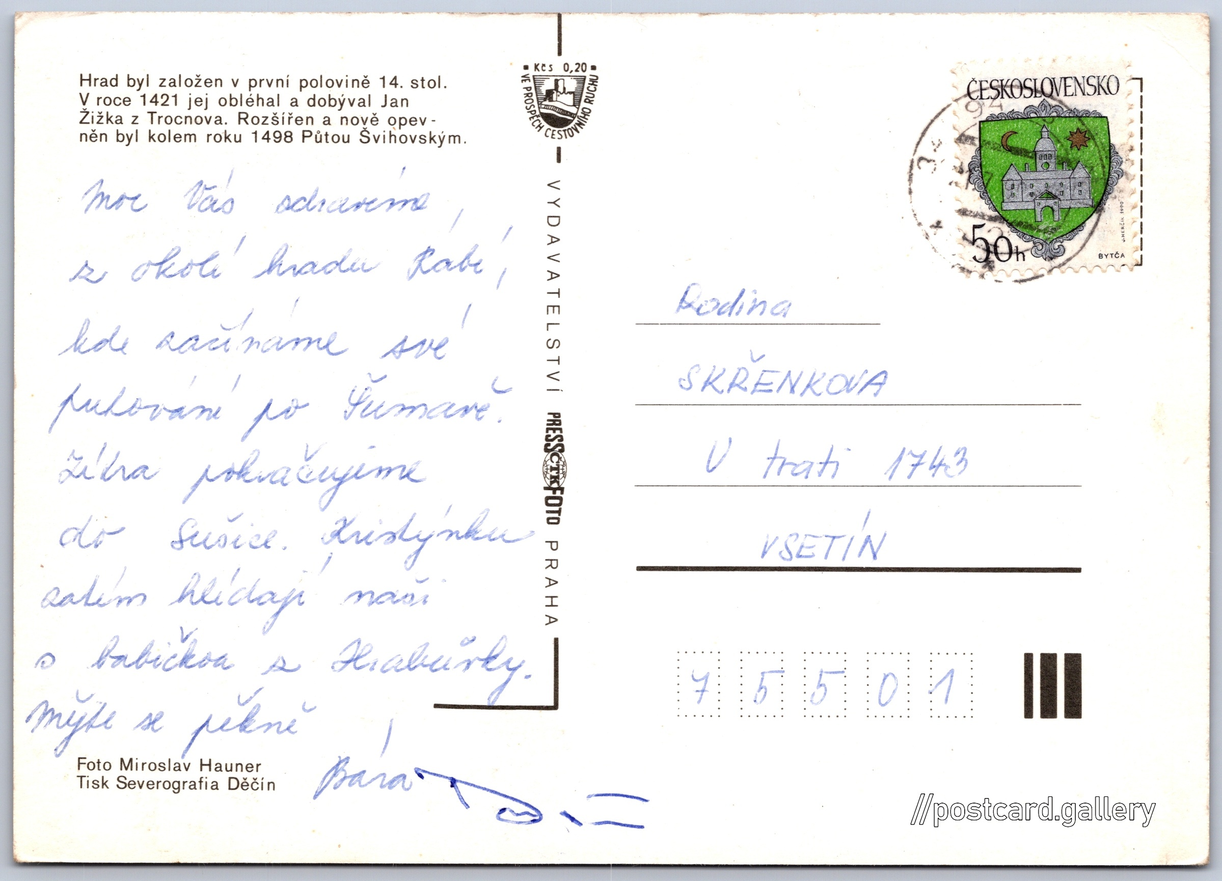 Hrad Rabí 1/4 Pokud chcete vidět pohlednice ve vyšším rozlišení nebo zobrazovat jejich zadní stranu, tak se prosím nejdříve přihlašte Přihlásit Zaregistrovat Rabí Hrad byl založen v první polovině 14. stol. V roce 1421 jej obléhal a dobýval Jan Žižka z Trocnova. Rozšířen a nově opevněn byl kolem roku 1498 Půtou Švihovským. Jazyk tištěného textu na pohlednici: čeština Zřícenina hradu Rabí, Zřícenina, Rabí, Česko ukázat na mapě V blízkém okolí místa zobrazeného na pohlednici lze najít 6 jiných pohlednic. Zobrazit blízké pohlednice Vydavatel: PressFoto Praha (Československo) Odhadované datum vydání pohlednice: 1987 - 1990 Pomozte nám zpřesnit rok vzniku pohlednice Velikost (š x v) a tvar pohlednice: 148 x 105 mm (5.83" x 4.13"), obdélník Osoby spjaté s touto pohlednicí: Jan Žižka z Trocnova(Obsah pohlednice) Miroslav Hauner(Autor fotografie) Půta Švihovský z Rýzmberka(Obsah pohlednice) Prošlá poštou Ceny: Příplatek na tur. ruch: 0,20 Kčs (CSK))Vyplacené známky: 0,50 Kčs (CSK) DiskuseVložit příspěvek Přidat novou složku ... Spravovat složky ...