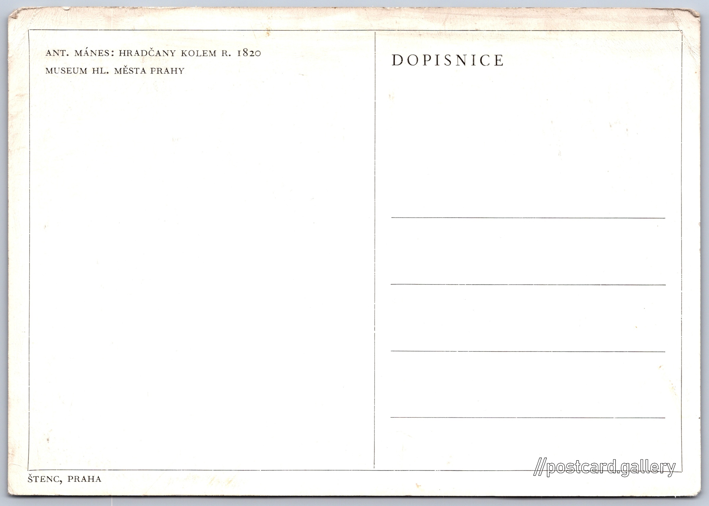 Hradčany, obraz Antonína Mánese Pokud chcete vidět pohlednice ve vyšším rozlišení nebo zobrazovat jejich zadní stranu, tak se prosím nejdříve přihlašte Přihlásit Zaregistrovat ANT. MÁNES: HRADČANY KOLEM R. 1820MUSEUM HL. MĚSTA PRAHYŠTENC, PRAHADOPISNICE Jazyk tištěného textu na pohlednici: čeština Pražský hrad, Hrad, Hrad III. nádvoří, Praha, Česko ukázat na mapě V blízkém okolí místa zobrazeného na pohlednici lze najít 159 jiných pohlednic. Zobrazit blízké pohlednice Vydavatel: Štenc (Československo) Datum vydání není známo Pomozte nám odhadnout datum vzniku pohlednice Velikost (š x v) a tvar pohlednice: 148 x 104 mm (5.83" x 4.09"), obdélník Osoby spjaté s touto pohlednicí: Antonín Mánes(Autor předlohy) Čistá pohlednice (neprošlá poštou) DiskuseVložit příspěvek Přidat novou složku ... Spravovat složky ...
