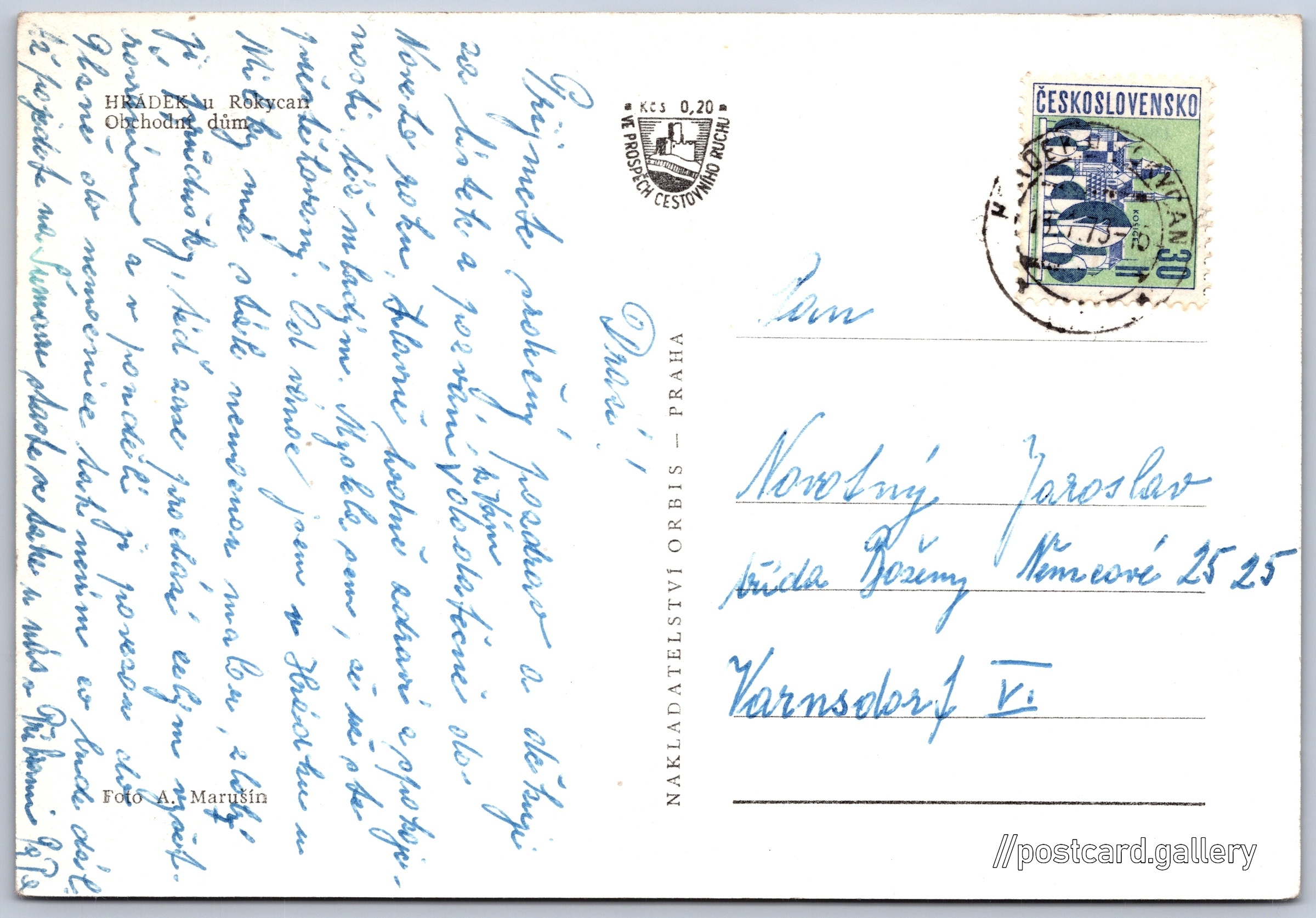 Hrádek u Rokycan, obchodní dům Pokud chcete vidět pohlednice ve vyšším rozlišení nebo zobrazovat jejich zadní stranu, tak se prosím nejdříve přihlašte Přihlásit Zaregistrovat HRÁDEK u RokycanObchodní dům Jazyk tištěného textu na pohlednici: čeština 1. máje 175, Hrádek, 338 42, Rokycany ukázat na mapě Vydavatel: Nakladatelství Orbis (Československo) Odhadované datum vydání pohlednice: 1970 - 1973 Pomozte nám zpřesnit rok vzniku pohlednice Velikost (š x v) a tvar pohlednice: 147 x 101 mm (5.79" x 3.98"), obdélník Osoby spjaté s touto pohlednicí: A. Marušín(Autor fotografie) Prošlá poštou Ceny: Příplatek na tur. ruch: 0,20 Kčs (CSK))Vyplacené známky: 0,30 Kčs (CSK) DiskuseVložit příspěvek Přidat novou složku ... Spravovat složky ...
