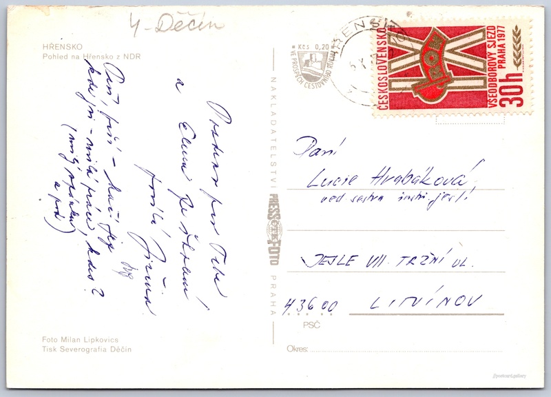 Hřensko Pokud chcete vidět pohlednice ve vyšším rozlišení nebo zobrazovat jejich zadní stranu, tak se prosím nejdříve přihlašte Přihlásit Zaregistrovat HŘENSKOPohled na Hřensko z NDR Jazyk tištěného textu na pohlednici: čeština Hřensko, Děčín ukázat na mapě V blízkém okolí místa zobrazeného na pohlednici lze najít 31 jiných pohlednic. Zobrazit blízké pohlednice Vydavatel: PressFoto Praha (Československo) Odhadované datum vydání pohlednice: 1974 - 1977 Pomozte nám zpřesnit rok vzniku pohlednice Velikost (š x v) a tvar pohlednice: 148 x 105 mm (5.83" x 4.13"), obdélník Osoby spjaté s touto pohlednicí: Milan Lipkovics(Autor fotografie) Prošlá poštou:Datum na razítku: 6.10.1977 Ceny: Příplatek na tur. ruch: 0,20 Kčs (CSK))Vyplacené známky: 0,30 Kčs (CSK) DiskuseVložit příspěvek Přidat novou složku ... Spravovat složky ...