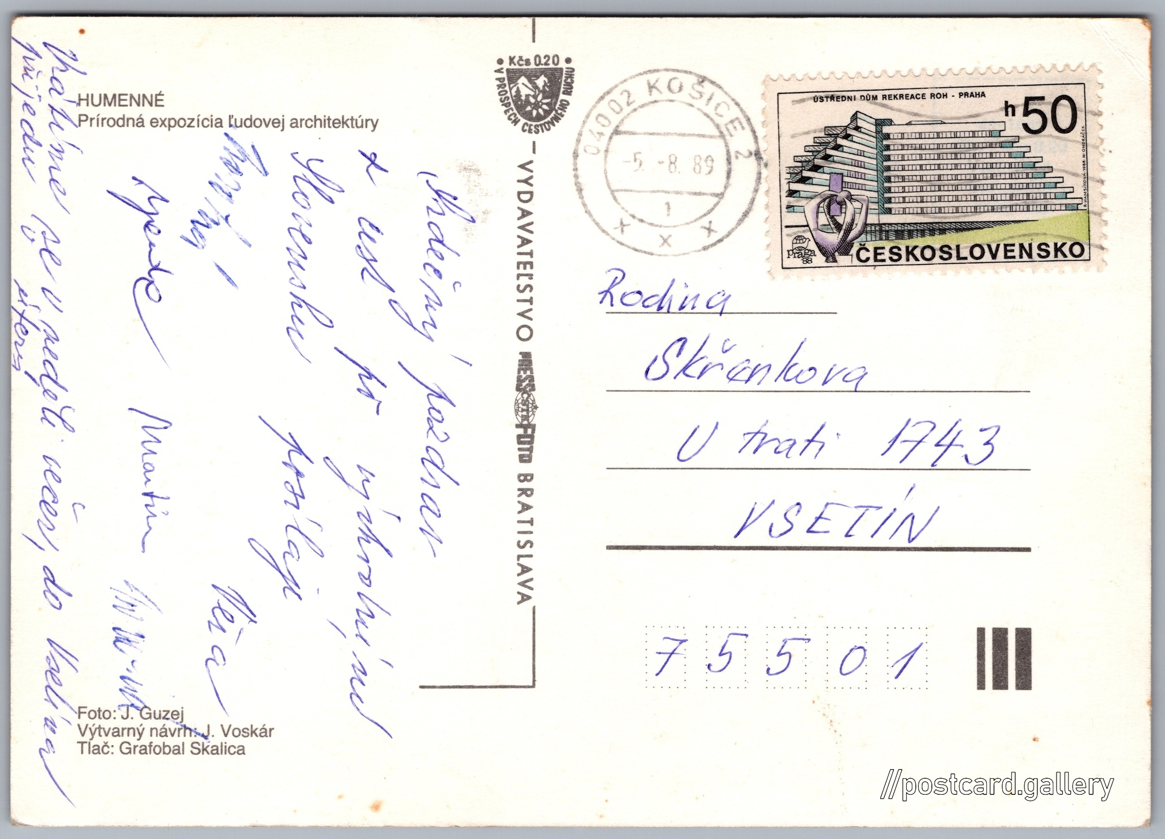 Humenné, expozícia ľudovej architektúry Pokud chcete vidět pohlednice ve vyšším rozlišení nebo zobrazovat jejich zadní stranu, tak se prosím nejdříve přihlašte Přihlásit Zaregistrovat Expozícia ľudovej architektúry HUMENNÉPrírodná expozícia ľudovej architektúry Jazyk tištěného textu na pohlednici: slovenština Vihorlatské múzeum v Humennom - expozícia ľudovej architektúry a bývania, Muzeum, Humenné, Slovensko ukázat na mapě Vydavatel: PressFoto Bratislava (Československo) Odhadované datum vydání pohlednice: 1986 - 1989 Pomozte nám zpřesnit rok vzniku pohlednice Velikost (š x v) a tvar pohlednice: 148 x 105 mm (5.83" x 4.13"), obdélník Osoby spjaté s touto pohlednicí: J. Voskár(Design pohlednice) J. Guzej(Autor fotografie) Prošlá poštou:Datum na razítku: 5.8.1989 Ceny: Příplatek na tur. ruch: 0,20 Kčs (CSK))Vyplacené známky: 0,50 Kčs (CSK) DiskuseVložit příspěvek Přidat novou složku ... Spravovat složky ...