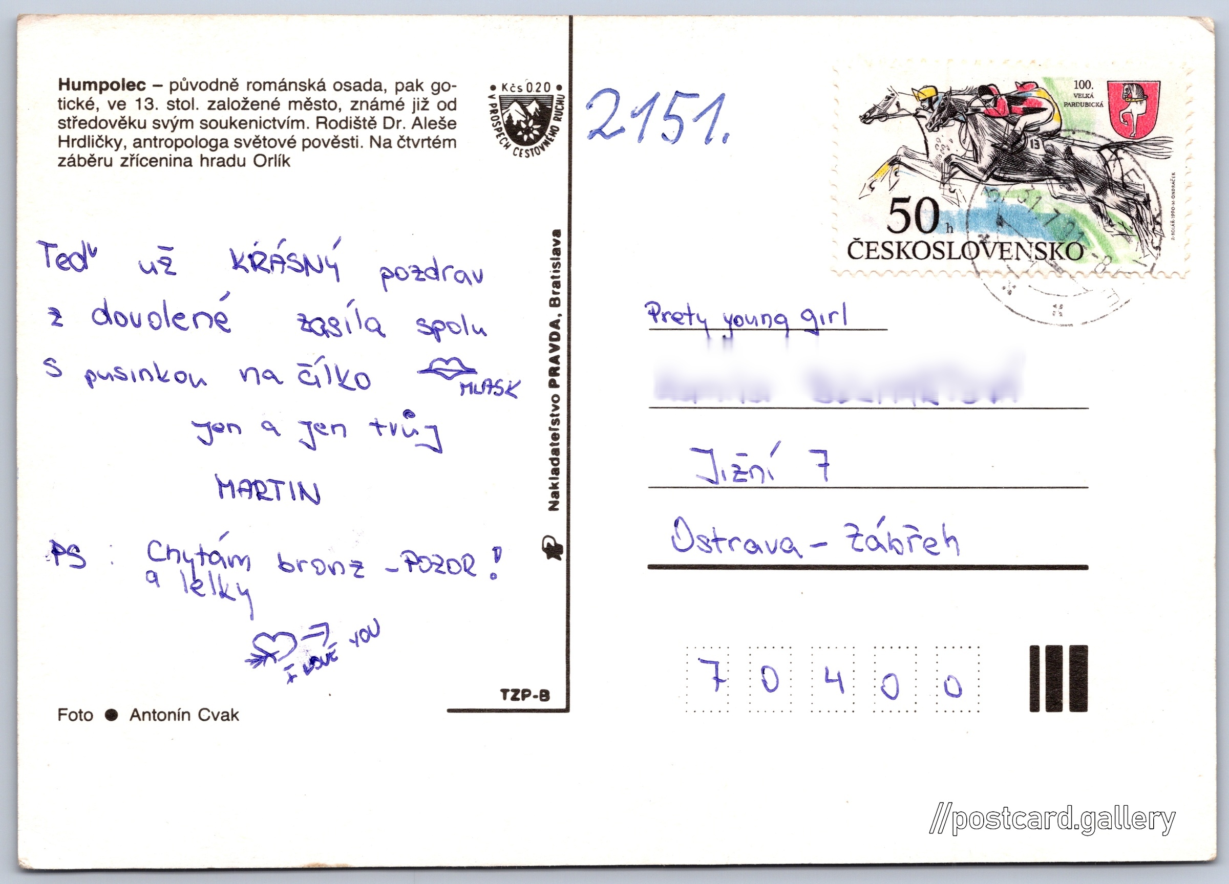 Humpolec Pokud chcete vidět pohlednice ve vyšším rozlišení nebo zobrazovat jejich zadní stranu, tak se prosím nejdříve přihlašte Přihlásit Zaregistrovat Humpolec Humpolec - původně románská osada, pak gotické, ve 13. stol. založené město, známé již od středověku svým soukenictvím. Rodiště Dr. Aleše Hrdličky, antropologa světové pověsti. Na čtvrtémzáběru zřícenina hradu Orlík. Jazyk tištěného textu na pohlednici: čeština Rozkoš, Humpolec, Pelhřimov ukázat na mapě Vydavatel: Nakladateľstvo PRAVDA, Bratislava (Československo) Odhadované datum vydání pohlednice: 1988 - 1991 Pomozte nám zpřesnit rok vzniku pohlednice Velikost (š x v) a tvar pohlednice: 147 x 106 mm (5.79" x 4.17"), obdélník Osoby spjaté s touto pohlednicí: Antonín Cvak(Autor fotografie) Dr. Aleš Hrdlička(Obsah pohlednice) Prošlá poštou:Datum na razítku: 31.7.1991 Ceny: Příplatek na tur. ruch: 0,20 Kčs (CSK))Vyplacené známky: 0,50 Kčs (CSK) DiskuseVložit příspěvek Přidat novou složku ... Spravovat složky ...