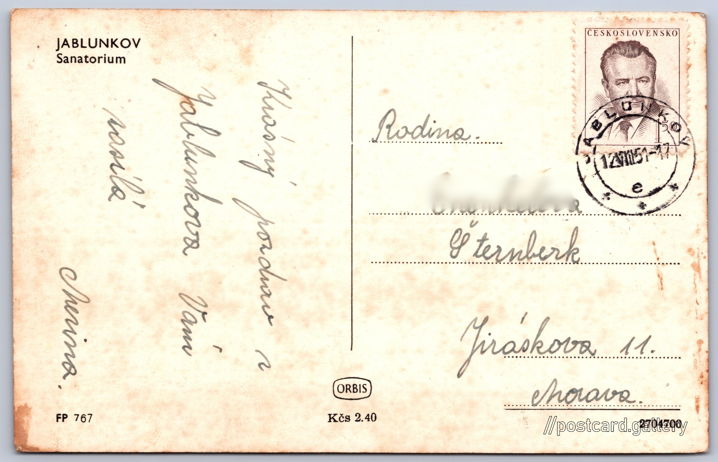Jablunkov, sanatorium Pokud chcete vidět pohlednice ve vyšším rozlišení nebo zobrazovat jejich zadní stranu, tak se prosím nejdříve přihlašte Přihlásit Zaregistrovat JABLUNKOVSanatorium Jazyk tištěného textu na pohlednici: čeština Jablunkov, Frýdek-Místek ukázat na mapě V blízkém okolí místa zobrazeného na pohlednici lze najít 6 jiných pohlednic. Zobrazit blízké pohlednice Vydavatel: Nakladatelství Orbis (Československo) Odhadované datum vydání pohlednice: 1948 - 1951 Pomozte nám zpřesnit rok vzniku pohlednice Velikost (š x v) a tvar pohlednice: 141 x 90 mm (5.55" x 3.54"), obdélník Prošlá poštou:Datum na razítku: 12.8.1951 Ceny: Cena pohlednice: 2,40 Kčs (CSK) Kódy na pohlednici: FP 767 2704700 DiskuseVložit příspěvek Přidat novou složku ... Spravovat složky ...