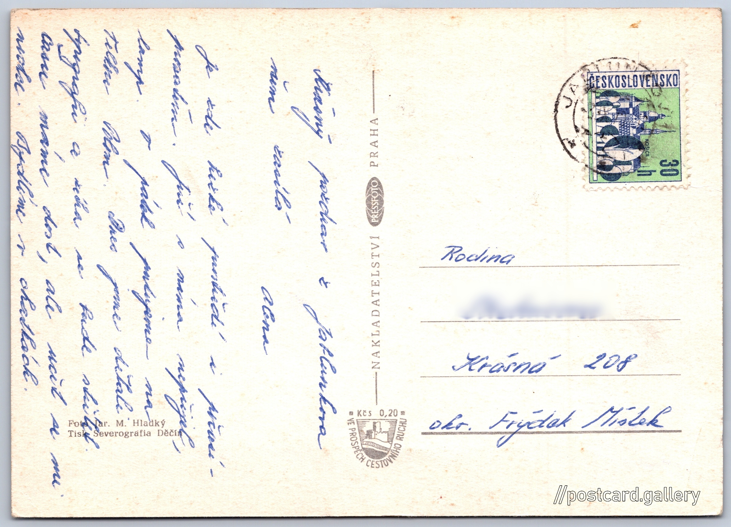 Jablunkov Pokud chcete vidět pohlednice ve vyšším rozlišení nebo zobrazovat jejich zadní stranu, tak se prosím nejdříve přihlašte Přihlásit Zaregistrovat Jablunkov Jazyk tištěného textu na pohlednici: čeština Mariánské náměstí 19, Jablunkov, 739 91, Frýdek-Místek ukázat na mapě Vydavatel: PressFoto Praha (Československo) Datum vydání není známo Pomozte nám odhadnout datum vzniku pohlednice Velikost (š x v) a tvar pohlednice: 148 x 105 mm (5.83" x 4.13"), obdélník Osoby spjaté s touto pohlednicí: Jar. M. Hladký(Autor fotografie) Prošlá poštou Ceny: Příplatek na tur. ruch: 0,20 Kčs (CSK))Vyplacené známky: 0,30 Kčs (CSK) DiskuseVložit příspěvek Přidat novou složku ... Spravovat složky ...