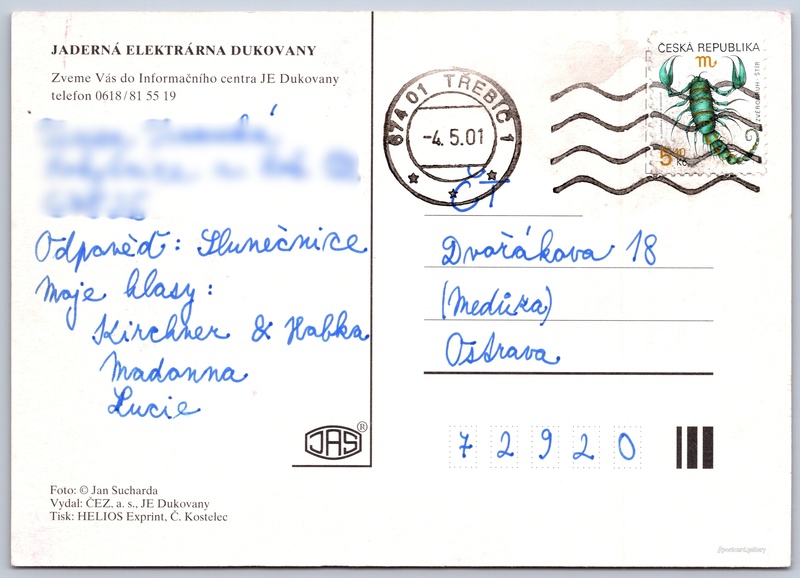 Jaderná elektrárna Dukovany, letecký záběr Pokud chcete vidět pohlednice ve vyšším rozlišení nebo zobrazovat jejich zadní stranu, tak se prosím nejdříve přihlašte Přihlásit Zaregistrovat Jaderná elektrárna DukovanyČEZ JADERNÁ ELEKTRÁRNA DUKOVANYZveme Vás do Informačního centra JE Dukovanytelefon 0618/81 55 19 Jazyk tištěného textu na pohlednici: čeština Jaderná elektrárna Dukovany, Elektrárna tepelná, jaderná, Rouchovany, Česko ukázat na mapě Vydavatel: ČEZ a.s. (Česko) Odhadované datum vydání pohlednice: 1998 - 2001 Pomozte nám zpřesnit rok vzniku pohlednice Velikost (š x v) a tvar pohlednice: 147 x 105 mm (5.79" x 4.13"), obdélník Osoby spjaté s touto pohlednicí: Jan Sucharda(Autor fotografie) Prošlá poštou:Datum na razítku: 4.5.2001 Ceny: Vyplacené známky: 5,40 Kč (CZK) DiskuseVložit příspěvek Přidat novou složku ... Spravovat složky ...