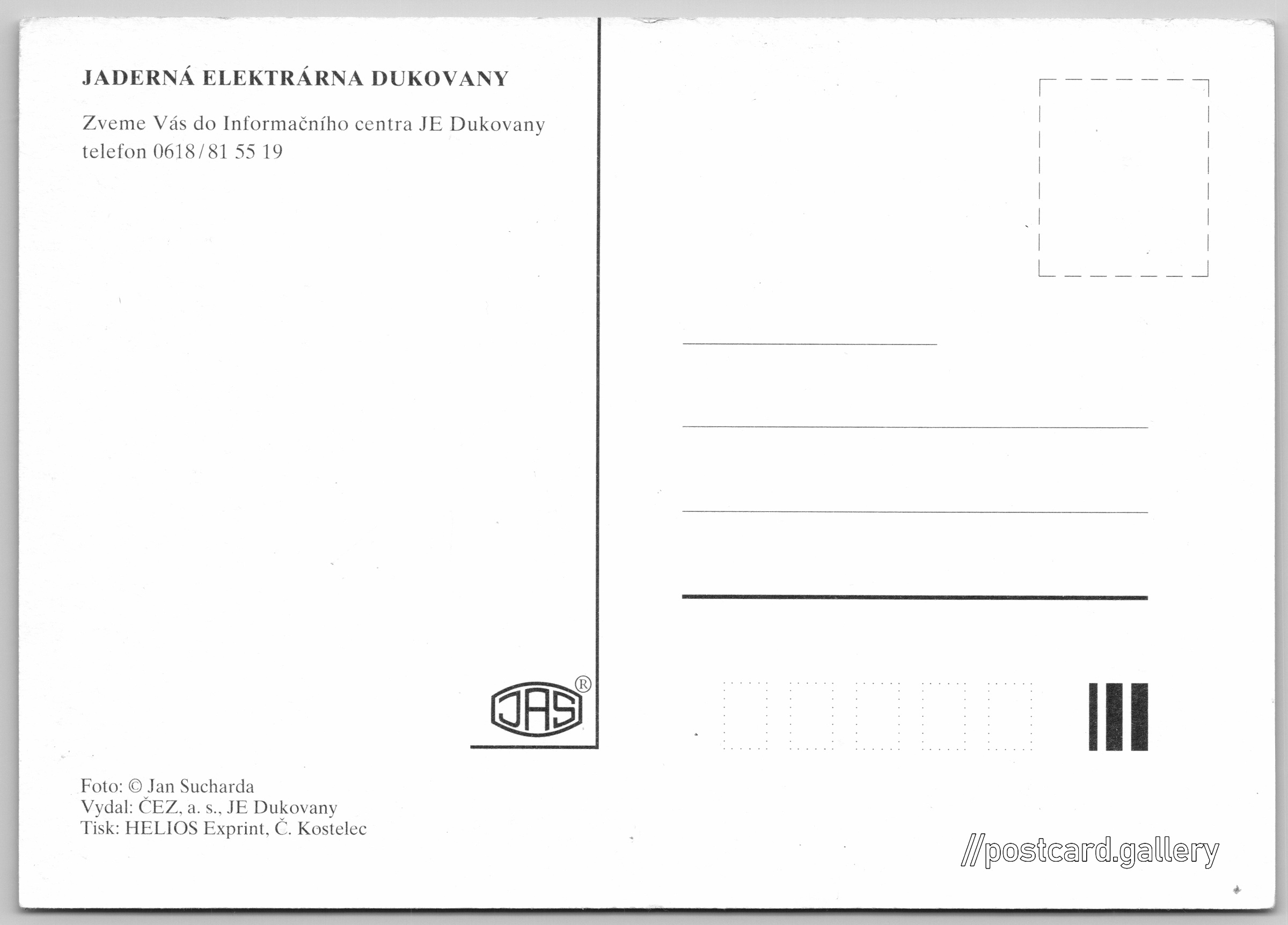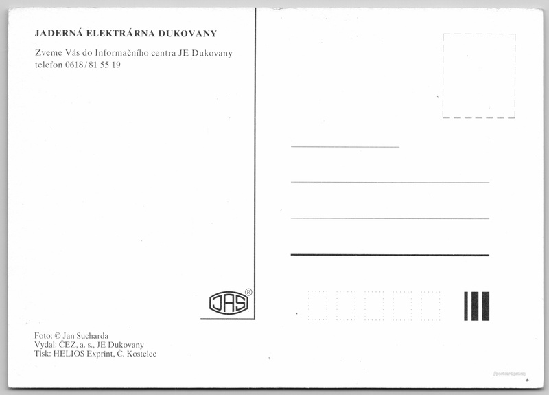 Jaderná elektrárna Dukovany, letecký záběr Pokud chcete vidět pohlednice ve vyšším rozlišení nebo zobrazovat jejich zadní stranu, tak se prosím nejdříve přihlašte Přihlásit Zaregistrovat Jaderná elektrárna DukovanyČEZ JADERNÁ ELEKTRÁRNA DUKOVANYZveme Vás do Informačního centra JE Dukovanytelefon 0618/81 55 19 Jazyk tištěného textu na pohlednici: čeština Jaderná elektrárna Dukovany, Elektrárna tepelná, jaderná, Rouchovany, Česko ukázat na mapě V blízkém okolí místa zobrazeného na pohlednici lze najít 7 jiných pohlednic. Zobrazit blízké pohlednice Vydavatel: ČEZ a.s. (Česko) Datum vydání není známo Pomozte nám odhadnout datum vzniku pohlednice Velikost (š x v) a tvar pohlednice: 147 x 105 mm (5.79" x 4.13"), obdélník Osoby spjaté s touto pohlednicí: Jan Sucharda(Autor fotografie) Čistá pohlednice (neprošlá poštou) DiskuseVložit příspěvek Přidat novou složku ... Spravovat složky ...