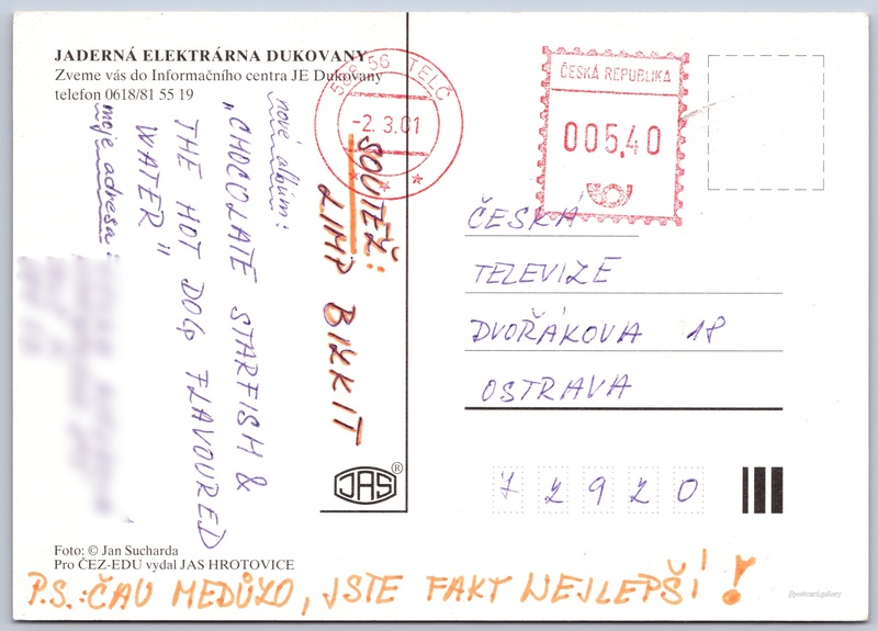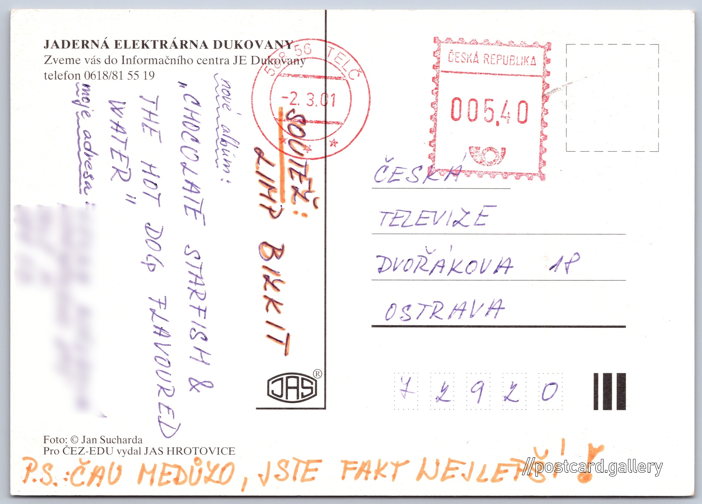 Jaderná elektrárna Dukovany Pokud chcete vidět pohlednice ve vyšším rozlišení nebo zobrazovat jejich zadní stranu, tak se prosím nejdříve přihlašte Přihlásit Zaregistrovat Jaderná elektrárna Dukovany JADERNÁ ELEKTRÁRNA DUKOVANYZveme vás do Informačního centra JE Dukovanytelefon 0618/81 55 19Pro ČEZ-EDU vydal JAS HROTOVICE Jazyk tištěného textu na pohlednici: čeština Jaderná elektrárna Dukovany, Elektrárna tepelná, jaderná, Rouchovany, Česko ukázat na mapě Vydavatel: JAS, Jan Sucharda (Česko)ČEZ a.s. (Česko) Odhadované datum vydání pohlednice: 1998 - 2001 Pomozte nám zpřesnit rok vzniku pohlednice Velikost (š x v) a tvar pohlednice: 147 x 105 mm (5.79" x 4.13"), obdélník Osoby spjaté s touto pohlednicí: Jan Sucharda(Autor fotografie) Prošlá poštou:Datum na razítku: 2.3.2001 Ceny: Vyplacené známky: 5,40 Kč (CZK) DiskuseVložit příspěvek Přidat novou složku ... Spravovat složky ...