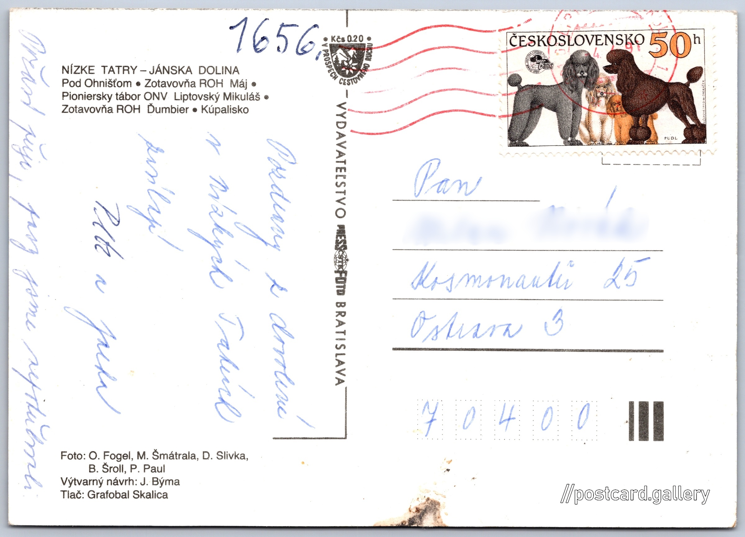 Jánska dolina Pokud chcete vidět pohlednice ve vyšším rozlišení nebo zobrazovat jejich zadní stranu, tak se prosím nejdříve přihlašte Přihlásit Zaregistrovat Jánska dolina NÍZKE TATRY - JÁNSKA DOLINA- Pod Ohnišťom- Zotavovňa ROH Máj- Pioniersky tábor ONV Liptovský Mikuláš- Zotavovňa ROH Ďumbier- Kúpalisko Jazyk tištěného textu na pohlednici: slovenština Liptovská Porúbka ukázat na mapě Vydavatel: PressFoto Bratislava (Československo) Odhadované datum vydání pohlednice: 1988 - 1991 Pomozte nám zpřesnit rok vzniku pohlednice Velikost (š x v) a tvar pohlednice: 148 x 105 mm (5.83" x 4.13"), obdélník Osoby spjaté s touto pohlednicí: Petr Paul(Autor fotografie) D. Slivka(Autor fotografie) Milan Šmátrala(Autor fotografie) O. Fogel(Autor fotografie) J. Býma(Design pohlednice) B. Šroll(Autor fotografie) Prošlá poštou:Datum na razítku: 4.4.1991 Ceny: Příplatek na tur. ruch: 0,20 Kčs (CSK))Vyplacené známky: 0,50 Kčs (CSK) DiskuseVložit příspěvek Přidat novou složku ... Spravovat složky ...