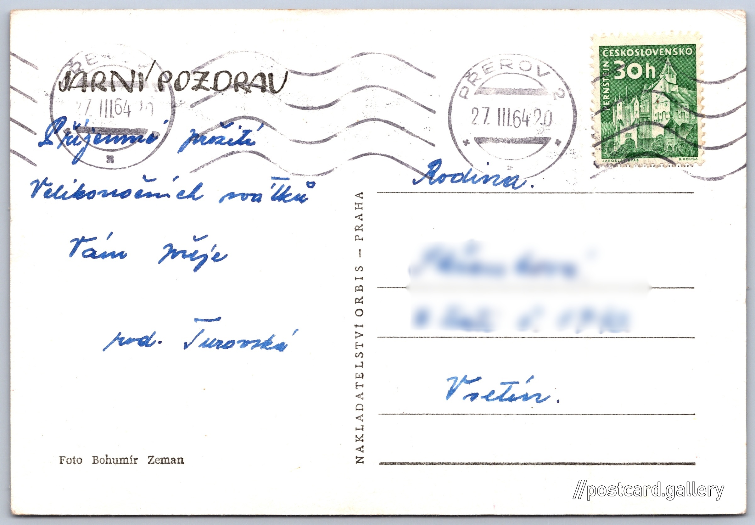 Jarní pozdrav Pokud chcete vidět pohlednice ve vyšším rozlišení nebo zobrazovat jejich zadní stranu, tak se prosím nejdříve přihlašte Přihlásit Zaregistrovat JARNÍ ROZDRAV Jazyk tištěného textu na pohlednici: čeština Vydavatel: Nakladatelství Orbis (Československo) Odhadované datum vydání pohlednice: 1961 - 1964 Pomozte nám zpřesnit rok vzniku pohlednice Velikost (š x v) a tvar pohlednice: 146 x 100 mm (5.75" x 3.94"), obdélník Osoby spjaté s touto pohlednicí: Bohumír Zeman(Autor fotografie) Prošlá poštou:Datum na razítku: 27.3.1964 Ceny: Vyplacené známky: 0,30 Kčs (CSK) DiskuseVložit příspěvek Přidat novou složku ... Spravovat složky ...